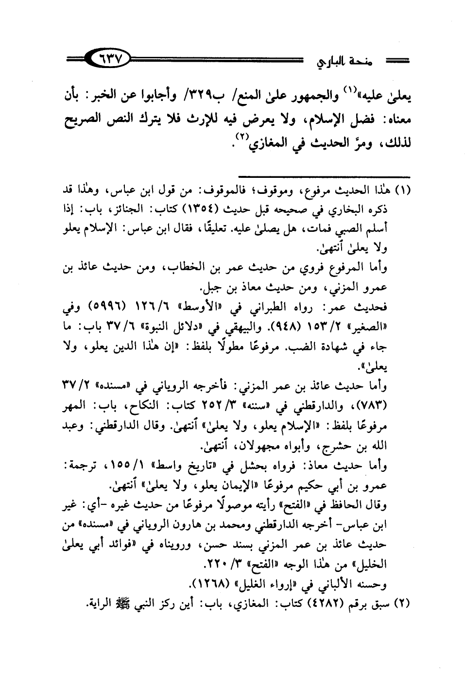 (¬1) هذا الحديث مرفوع، وموقوف؛ فالموقوف: من قول ابن عبّاس، وهذا قد ذكره البخاريّ في صحيحه قبل حديث (1354) كتاب: الجنائز، باب: إذا أسلم الصبي فمات، هل يصلّى عليه. تعليقًا، فقال ابن عبّاس: الإسلام يعلو ولا يعلى انتهى.