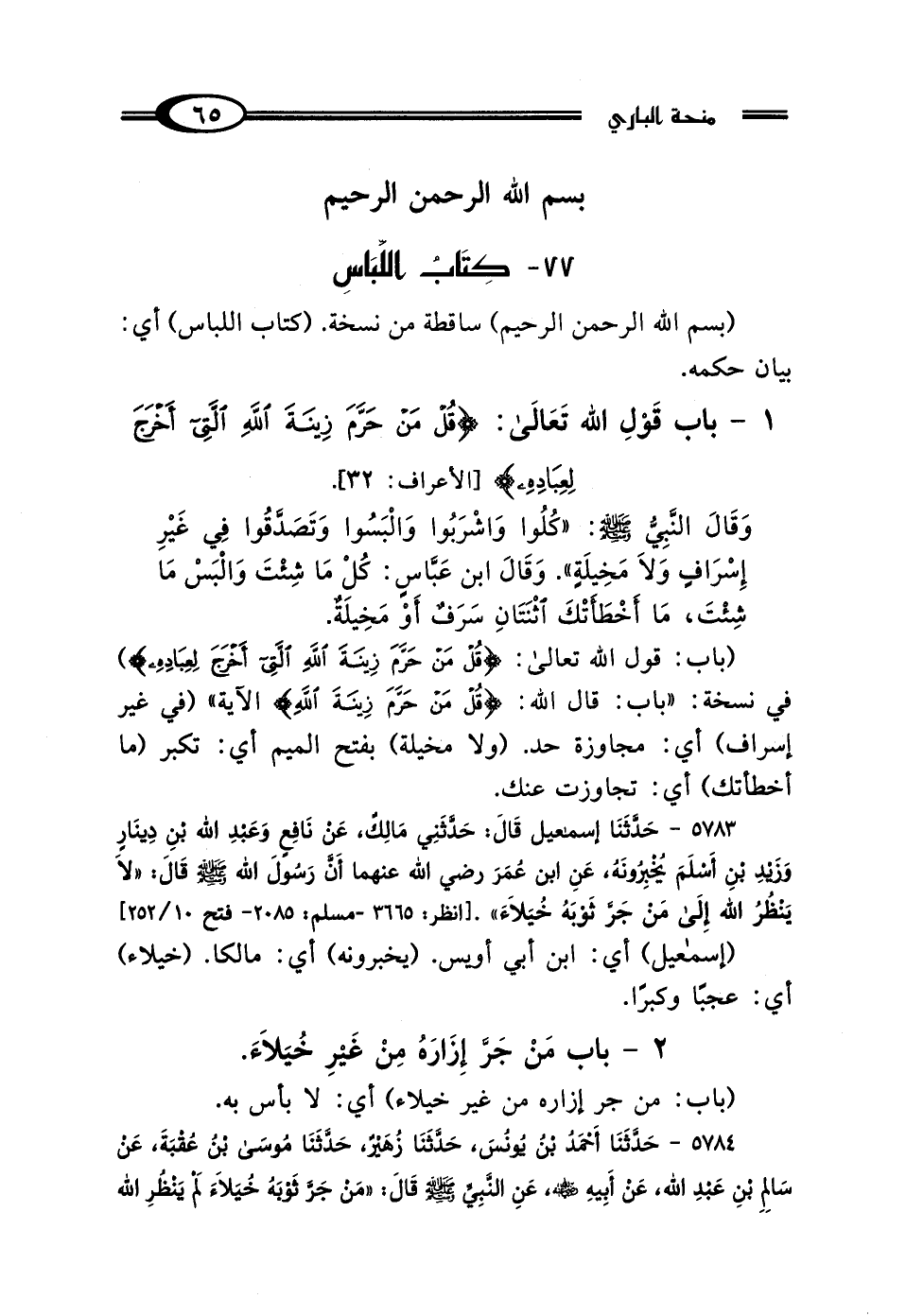 قَوْلِ اللَّهِ تَعَالى: {قُلْ مَنْ حَرَّمَ زِينَةَ اللَّهِ الَّتِي أَخْرَجَ لِعِبَادِهِ} [الأعراف: 32] وَقَال النَّبِيُّ صَلَّى اللهُ عَلَيْهِ وَسَلَّمَ: "كُلُوا وَاشْرَبُوا وَالبَسُوا وَتَصَدَّقُوا، فِي غَيْرِ إِسْرَافٍ وَلَا مَخِيلَةٍ. وَقَال ابْنُ عَبَّاسٍ: "كُلْ مَا شِئْتَ، وَالبَسْ مَا شِئْتَ، مَا أَخْطَأَتْكَ اثْنَتَانِ: سَرَفٌ، أَوْ مَخِيلَةٌ.