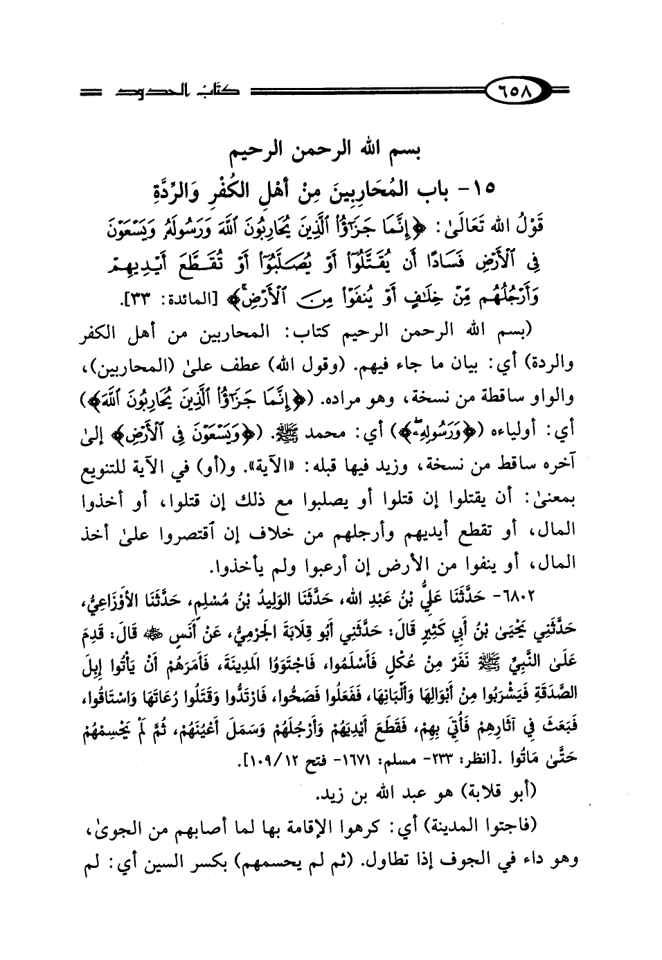 (بِسْمِ اللهِ الرَّحْمَنِ الرَّحِيمِ كتاب: المحاربين من أهل الكفر والردة) أي: بيان ما جاء فيهم. (وقول الله) عطف على (المحاربين)، والواو ساقطة من نسخة، وهو مراده. ({إِنَّمَا جَزَاءُ الَّذِينَ يُحَارِبُونَ اللَّهَ}) أي: أولياءه ({وَرَسُولَهُ}) أي: محمّد - صلى الله عليه وسلم -. ({وَيَسْعَوْنَ فِي الْأَرْضِ}) إلى آخره ساقط من نسخة، وزيد فيها قبله: "الآية". و (أو) في الآية للتنويع بمعنى: أن يقتلوا إن قتلوا أو يصلبوا مع ذلك إن قتلوا، أو أخذوا المال، أو تقطع أيديهم وأرجلهم من خلاف إن اقتصروا على أخذ المال، أو ينفوا من الأرض إن أرعبوا ولم يأخذوا.