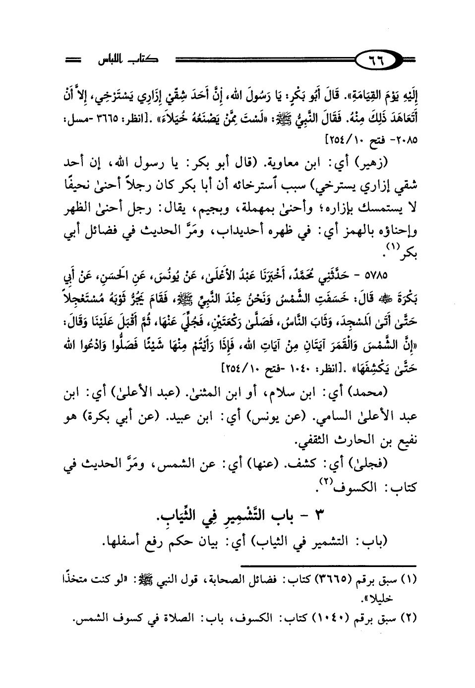 5785 - حَدَّثَنِي مُحَمَّدٌ، أَخْبَرَنَا عَبْدُ الأَعْلَى، عَنْ يُونُسَ، عَنِ الحَسَنِ، عَنْ أَبِي بَكْرَةَ رَضِيَ اللَّهُ عَنْهُ قَال: خَسَفَتِ الشَّمْسُ وَنَحْنُ عِنْدَ النَّبِيِّ صَلَّى اللهُ عَلَيْهِ وَسَلَّمَ، فَقَامَ يَجُرُّ ثَوْبَهُ مُسْتَعْجِلًا، حَتَّى أَتَى المَسْجِدَ، وَثَابَ النَّاسُ، فَصَلَّى رَكْعَتَيْنِ فَجُلِّيَ عَنْهَا، ثُمَّ أَقْبَلَ عَلَيْنَا، وَقَال: "إِنَّ الشَّمْسَ وَالقَمَرَ آيَتَانِ مِنْ آيَاتِ اللَّهِ، فَإِذَا رَأَيْتُمْ مِنْهَا شَيْئًا فَصَلُّوا، وَادْعُوا اللَّهَ حَتَّى يَكْشِفَهَا".