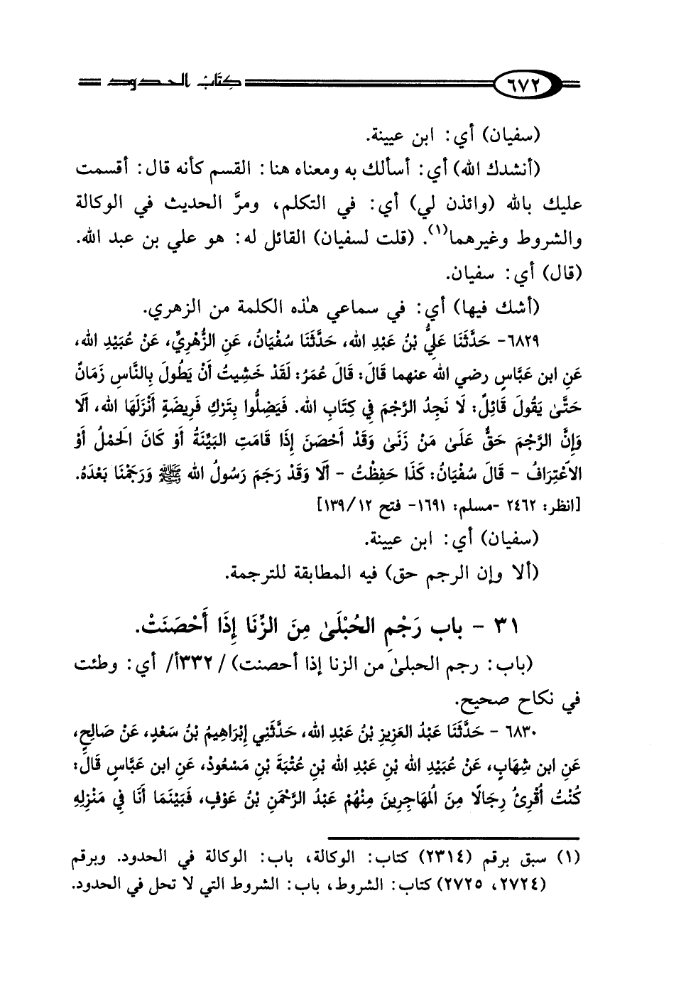 6829 - حَدَّثَنَا عَلِيُّ بْنُ عَبْدِ اللَّهِ، حَدَّثَنَا سُفْيَانُ، عَنِ الزُّهْرِيِّ، عَنْ عُبَيْدِ اللَّهِ، عَنِ ابْنِ عَبَّاسٍ رَضِيَ اللَّهُ عَنْهُمَا، قَال: قَال عُمَرُ: لَقَدْ خَشِيتُ أَنْ يَطُولَ بِالنَّاسِ زَمَانٌ، حَتَّى يَقُولَ قَائِلٌ: لَا نَجِدُ الرَّجْمَ فِي كِتَابِ اللَّهِ، فَيَضِلُّوا بِتَرْكِ فَرِيضَةٍ أَنْزَلَهَا اللَّهُ، أَلا وَإِنَّ الرَّجْمَ حَقٌّ عَلَى مَنْ زَنَى وَقَدْ أَحْصَنَ، إِذَا قَامَتِ البَيِّنَةُ، أَوْ كَانَ الحَبَلُ أَو الاعْتِرَافُ - قَال سُفْيَانُ: كَذَا حَفِظْتُ - أَلا وَقَدْ "رَجَمَ رَسُولُ اللَّهِ صَلَّى اللهُ عَلَيْهِ وَسَلَّمَ وَرَجَمْنَا بَعْدَهُ".