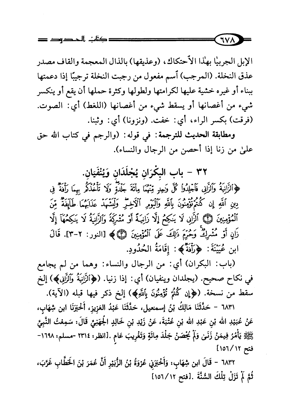 {الزَّانِيَةُ وَالزَّانِي فَاجْلِدُوا كُلَّ وَاحِدٍ مِنْهُمَا مِائَةَ جَلْدَةٍ وَلَا تَأْخُذْكُمْ بِهِمَا رَأْفَةٌ فِي دِينِ اللَّهِ إِنْ كُنْتُمْ تُؤْمِنُونَ بِاللَّهِ وَاليَوْمِ الآخِرِ وَلْيَشْهَدْ عَذَابَهُمَا طَائِفَةٌ مِنَ المُؤْمِنِينَ الزَّانِي لَا يَنْكِحُ إلا زَانِيَةً أَوْ مُشْرِكَةً وَالزَّانِيَةُ لَا يَنْكِحُهَا إلا زَانٍ أَوْ مُشْرِكٌ وَحُرِّمَ ذَلِكَ عَلَى المُؤْمِنِينَ} قَال ابْنُ عُيَيْنَةَ: "رَأْفَةٌ: إِقَامَةُ الحُدُودِ.