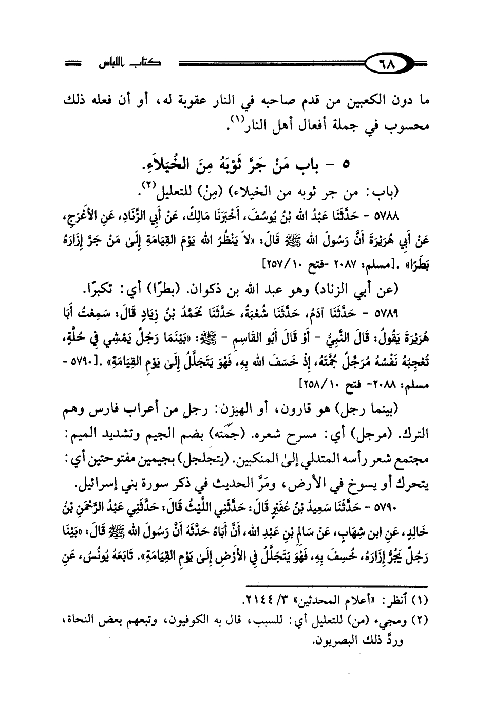 5790 - حَدَّثَنَا سَعِيدُ بْنُ عُفَيْرٍ، قَال: حَدَّثَنِي اللَّيْثُ، قَال: حَدَّثَنِي عَبْدُ الرَّحْمَنِ بْنُ خَالِدٍ، عَنِ ابْنِ شِهَابٍ، عَنْ سَالِمِ بْنِ عَبْدِ اللَّهِ، أَنَّ أَبَاهُ، حَدَّثَهُ: أَنَّ رَسُولَ اللَّهِ صَلَّى اللهُ عَلَيْهِ وَسَلَّمَ قَال: "بَيْنَا رَجُلٌ يَجُرُّ إِزَارَهُ، إِذْ خُسِفَ بِهِ، فَهُوَ يَتَجَلَّلُ فِي الأَرْضِ إِلَى يَوْمِ القِيَامَةِ" تَابَعَهُ يُونُسُ، عَنِ