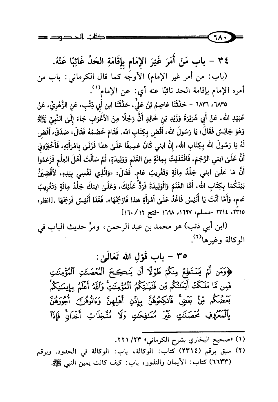 6835، 6836 - حَدَّثَنَا عَاصِمُ بْنُ عَلِيٍّ، حَدَّثَنَا ابْنُ أَبِي ذِئْبٍ، عَنِ الزُّهْرِيِّ، عَنْ عُبَيْدِ اللَّهِ، عَنْ أَبِي هُرَيْرَةَ، وَزَيْدِ بْنِ خَالِدٍ: أَنَّ رَجُلًا مِنَ الأَعْرَابِ جَاءَ إِلَى النَّبِيِّ صَلَّى اللهُ عَلَيْهِ وَسَلَّمَ وَهُوَ جَالِسٌ، فَقَال: يَا رَسُولَ اللَّهِ، اقْضِ بِكِتَابِ اللَّهِ، فَقَامَ خَصْمُهُ فَقَال: صَدَقَ، اقْضِ لَهُ يَا رَسُولَ اللَّهِ بِكِتَابِ اللَّهِ، إِنَّ ابْنِي كَانَ عَسِيفًا عَلَى هَذَا فَزَنَى بِامْرَأَتِهِ، فَأَخْبَرُونِي أَنَّ عَلَى ابْنِي الرَّجْمَ، فَافْتَدَيْتُ بِمِائَةٍ مِنَ الغَنَمِ وَوَلِيدَةٍ، ثُمَّ سَأَلْتُ أَهْلَ العِلْمِ، فَزَعَمُوا أَنَّ مَا عَلَى ابْنِي جَلْدُ مِائَةٍ وَتَغْرِيبُ عَامٍ، فَقَال: "وَالَّذِي نَفْسِي بِيَدِهِ، لَأَقْضِيَنَّ بَيْنَكُمَا بِكِتَابِ اللَّهِ، أَمَّا الغَنَمُ وَالوَلِيدَةُ فَرَدٌّ عَلَيْكَ، وَعَلَى ابْنِكَ جَلْدُ مِائَةٍ وَتَغْرِيبُ عَامٍ، وَأَمَّا أَنْتَ يَا أُنَيْسُ، فَاغْدُ عَلَى امْرَأَةِ هَذَا فَارْجُمْهَا" فَغَدَا أُنَيْسٌ فَرَجَمَهَا.