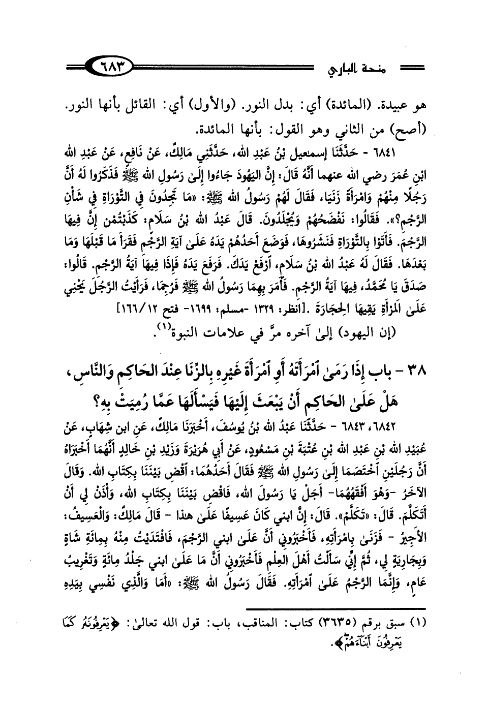 6841 - حَدَّثَنَا إِسْمَاعِيلُ بْنُ عَبْدِ اللَّهِ، حَدَّثَنِي مَالِكٌ، عَنْ نَافِعٍ، عَنْ عَبْدِ اللَّهِ بْنِ عُمَرَ رَضِيَ اللَّهُ عَنْهُمَا، أَنَّهُ قَال: إِنَّ اليَهُودَ جَاءُوا إِلَى رَسُولِ اللَّهِ صَلَّى اللهُ عَلَيْهِ وَسَلَّمَ، فَذَكَرُوا لَهُ أَنَّ رَجُلًا مِنْهُمْ وَامْرَأَةً زَنَيَا، فَقَال لَهُمْ رَسُولُ اللَّهِ صَلَّى اللهُ عَلَيْهِ وَسَلَّمَ: "مَا تَجِدُونَ فِي التَّوْرَاةِ فِي شَأْنِ الرَّجْمِ" فَقَالُوا: نَفْضَحُهُمْ وَيُجْلَدُونَ، قَال عَبْدُ اللَّهِ بْنُ سَلامٍ: كَذَبْتُمْ إِنَّ فِيهَا الرَّجْمَ، فَأَتَوْا بِالتَّوْرَاةِ فَنَشَرُوهَا، فَوَضَعَ أَحَدُهُمْ يَدَهُ عَلَى آيَةِ الرَّجْمِ، فَقَرَأَ مَا قَبْلَهَا وَمَا بَعْدَهَا، فَقَال لَهُ عَبْدُ اللَّهِ بْنُ سَلامٍ: ارْفَعْ يَدَكَ فَرَفَعَ يَدَهُ فَإِذَا فِيهَا آيَةُ الرَّجْمِ، قَالُوا: صَدَقَ يَا مُحَمَّدُ فِيهَا آيَةُ الرَّجْمِ، فَأَمَرَ بِهِمَا رَسُولُ اللَّهِ صَلَّى اللهُ عَلَيْهِ وَسَلَّمَ فَرُجِمَا فَرَأَيْتُ الرَّجُلَ يَحْنِي عَلَى المَرْأَةِ، يَقِيهَا الحِجَارَةَ.