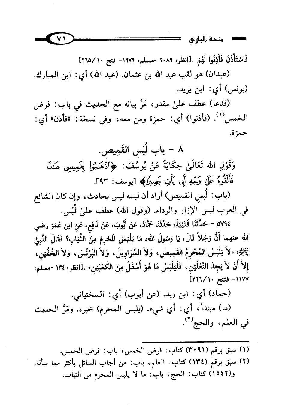 5794 - حَدَّثَنَا قُتَيْبَةُ، حَدَّثَنَا حَمَّادٌ، عَنْ أَيُّوبَ، عَنْ نَافِعٍ، عَنِ ابْنِ عُمَرَ رَضِيَ اللَّهُ عَنْهُمَا: أَنَّ رَجُلًا قَال: يَا رَسُولَ اللَّهِ، مَا يَلْبَسُ المُحْرِمُ مِنَ الثِّيَابِ؟ فَقَال النَّبِيُّ صَلَّى اللهُ عَلَيْهِ وَسَلَّمَ: "لَا يَلْبَسُ المُحْرِمُ القَمِيصَ، وَلَا السَّرَاويلَ، وَلَا البُرْنُسَ، وَلَا الخُفَّيْنِ، إلا أَنْ لَا يَجِدَ النَّعْلَيْنِ، فَلْيَلْبَسْ مَا هُوَ أَسْفَلُ مِنَ الكَعْبَيْنِ".