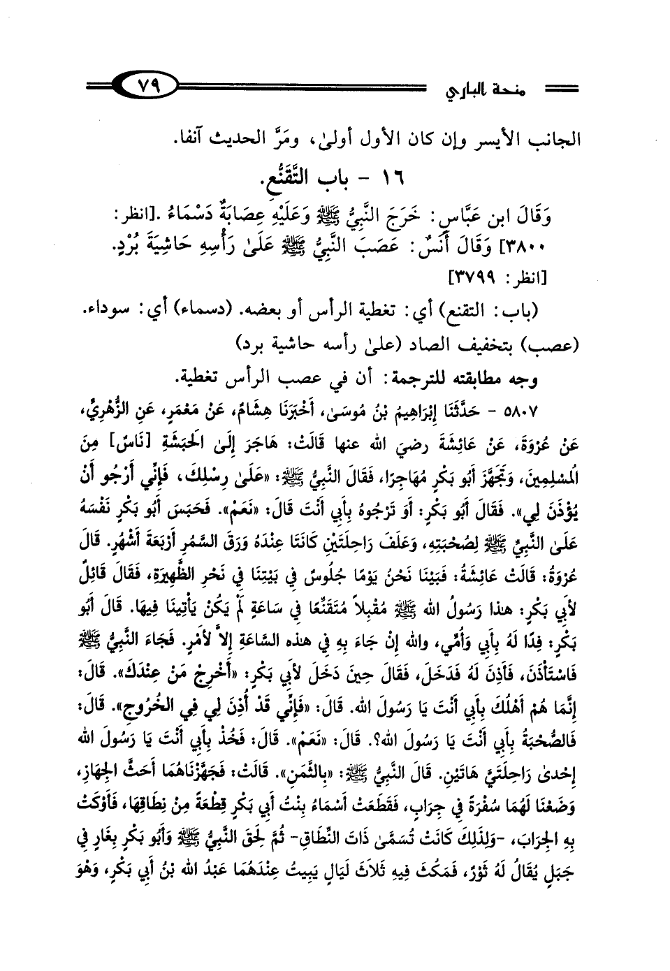[انظر: 3800] وَقَال أَنَسٌ: "عَصَبَ النَّبِيُّ صَلَّى اللهُ عَلَيْهِ وَسَلَّمَ عَلَى رَأْسِهِ حَاشِيَةَ بُرْدٍ".