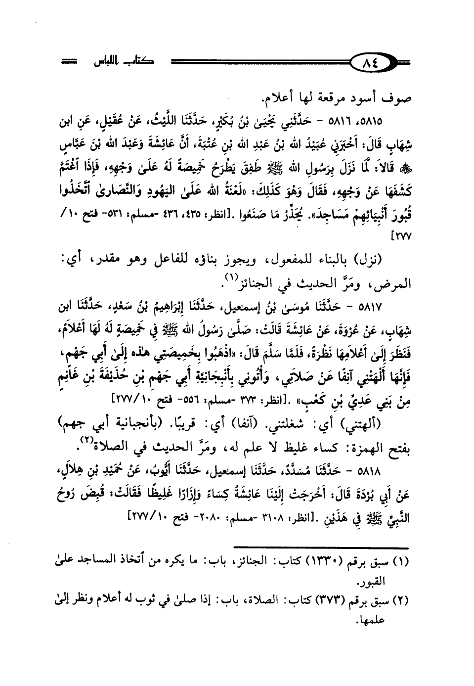 5815، 5816 - حَدَّثَنِي يَحْيَى بْنُ بُكَيْرٍ، حَدَّثَنَا اللَّيْثُ، عَنْ عُقَيْلٍ، عَنِ ابْنِ شِهَابٍ، قَال: أَخْبَرَنِي عُبَيْدُ اللَّهِ بْنُ عَبْدِ اللَّهِ بْنِ عُتْبَةَ، أَنَّ عَائِشَةَ، وَعَبْدَ اللَّهِ بْنَ عَبَّاسٍ، رَضِيَ اللَّهُ عَنْهُمْ قَالا: لَمَّا نَزَلَ بِرَسُولِ اللَّهِ صَلَّى اللهُ عَلَيْهِ وَسَلَّمَ، طَفِقَ يَطْرَحُ خَمِيصَةً لَهُ عَلَى وَجْهِهِ، فَإِذَا اغْتَمَّ كَشَفَهَا عَنْ وَجْهِهِ، فَقَال وَهُوَ كَذَلِكَ: "لَعْنَةُ اللَّهِ عَلَى اليَهُودِ وَالنَّصَارَى، اتَّخَذُوا قُبُورَ أَنْبِيَائِهِمْ مَسَاجِدَ" يُحَذِّرُ مَا صَنَعُوا.