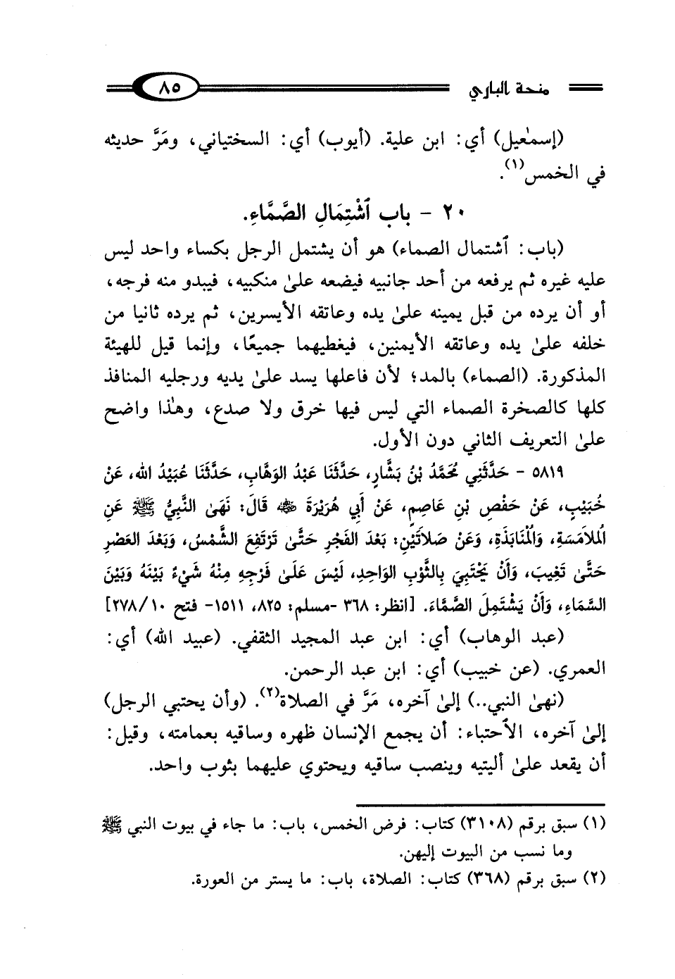 5819 - حَدَّثَنِي مُحَمَّدُ بْنُ بَشَّارٍ، حَدَّثَنَا عَبْدُ الوَهَّابِ، حَدَّثَنَا عُبَيْدُ اللَّهِ، عَنْ خُبَيْبٍ، عَنْ حَفْصِ بْنِ عَاصِمٍ، عَنْ أَبِي هُرَيْرَةَ رَضِيَ اللَّهُ عَنْهُ قَال: "نَهَى النَّبِيُّ صَلَّى اللهُ عَلَيْهِ وَسَلَّمَ عَنِ المُلامَسَةِ وَالمُنَابَذَةِ، وَعَنْ صَلاتَيْنِ: بَعْدَ الفَجْرِ حَتَّى تَرْتَفِعَ الشَّمْسُ، وَبَعْدَ العَصْرِ حَتَّى تَغِيبَ، وَأَنْ يَحْتَبِيَ بِالثَّوْبِ الوَاحِدِ لَيْسَ عَلَى فَرْجِهِ مِنْهُ شَيْءٌ بَيْنَهُ وَبَيْنَ السَّمَاءِ، وَأَنْ يَشْتَمِلَ الصَّمَّاءَ.