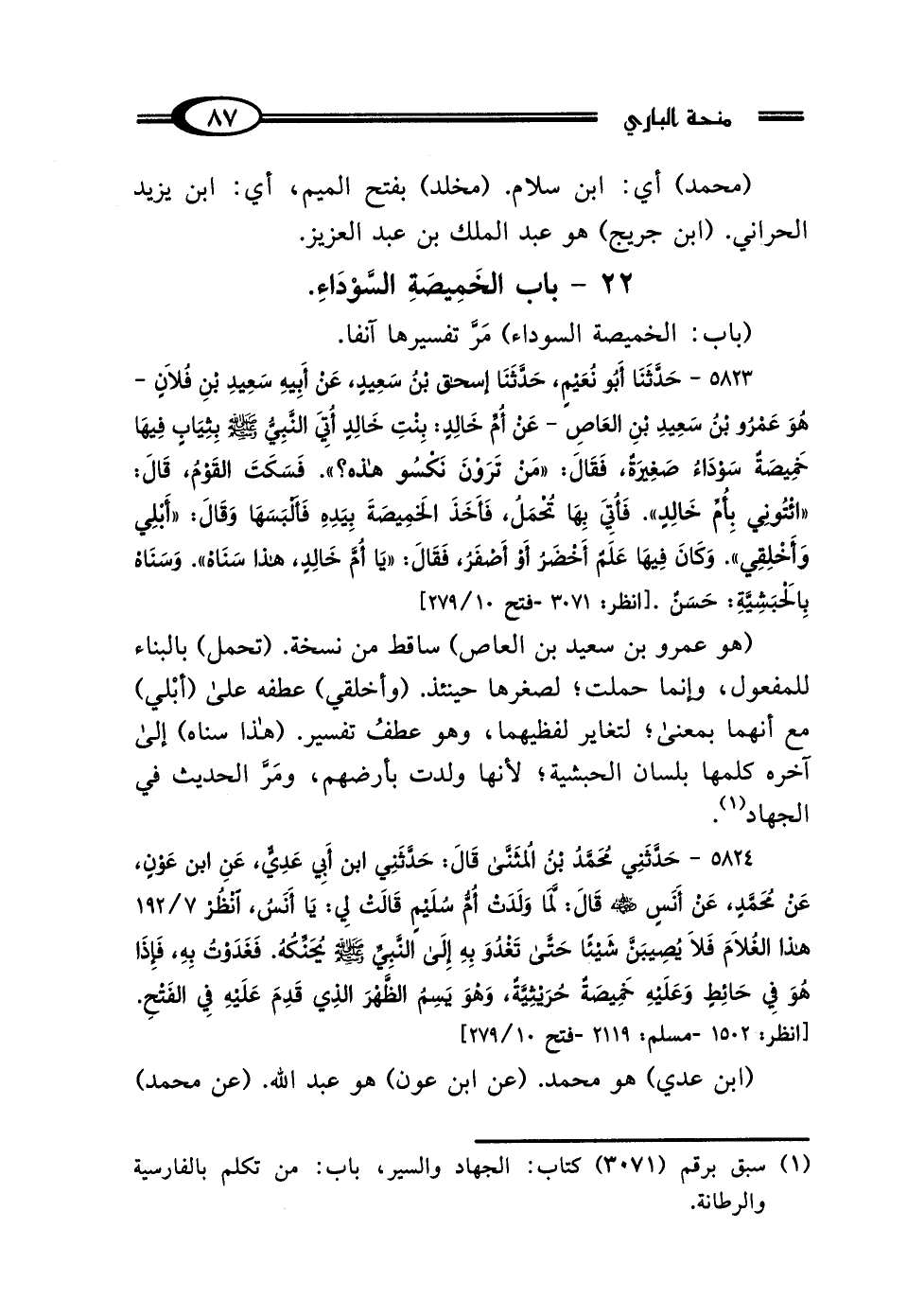 5823 - حَدَّثَنَا أَبُو نُعَيْمٍ، حَدَّثَنَا إِسْحَاقُ بْنُ سَعِيدٍ، عَنْ أَبِيهِ سَعِيدِ بْنِ فُلانٍ هُوَ عَمْرُو بْنُ سَعِيدِ بْنِ العَاصِ، عَنْ أُمِّ خَالِدٍ بِنْتِ خَالِدٍ: أُتِيَ النَّبِيُّ صَلَّى اللهُ عَلَيْهِ وَسَلَّمَ بِثِيَابٍ فِيهَا خَمِيصَةٌ سَوْدَاءُ صَغِيرَةٌ، فَقَال: "مَنْ تَرَوْنَ أَنْ نَكْسُوَ هَذِهِ" فَسَكَتَ القَوْمُ، قَال: "ائْتُونِي بِأُمِّ خَالِدٍ" فَأُتِيَ بِهَا تُحْمَلُ، فَأَخَذَ الخَمِيصَةَ بِيَدِهِ فَأَلْبَسَهَا، وَقَال: "أَبْلِي وَأَخْلِقِي" وَكَانَ فِيهَا عَلَمٌ أَخْضَرُ أَوْ أَصْفَرُ، فَقَال: "يَا أُمَّ خَالِدٍ، هَذَا سَنَاهْ" وَسَنَاهْ بِالحَبَشِيَّةِ حَسَنٌ.