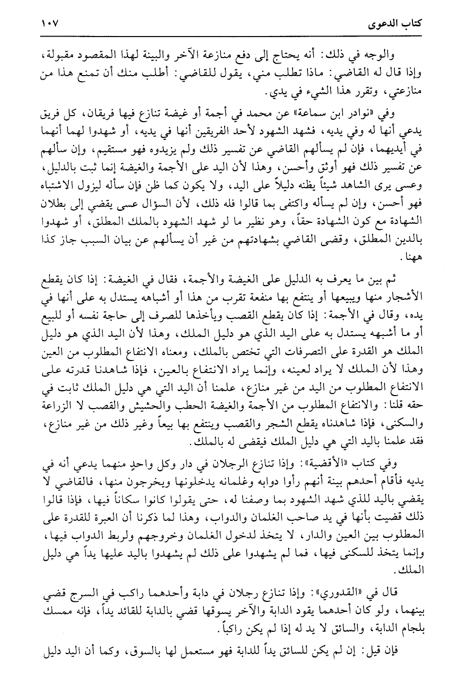 وفي كتاب «الأقضية» : وإذا تنازع الرجلان في دار وكل واحدٍ منهما يدعي أنه في يديه فأقام أحدهم بينة أنهم رأوا دوابه وغلمانه يدخلونها ويخرجون منها، فالقاضي لا يقضي باليد للذي شهد الشهود بما وصفنا له، حتى يقولوا كانوا سكاناً فيها، فإذا قالوا ذلك قضيت بأنها في يد صاحب الغلمان والدواب، وهذا لما ذكرنا أن العبرة للقدرة على المطلوب بين العين والدار، لا يتخذ لدخول الغلمان وخروجهم ولربط الدواب فيها، وإنما يتخذ للسكنى فيها، فما لم يشهدوا على ذلك لم يشهدوا باليد عليها يداً هي دليل الملك.