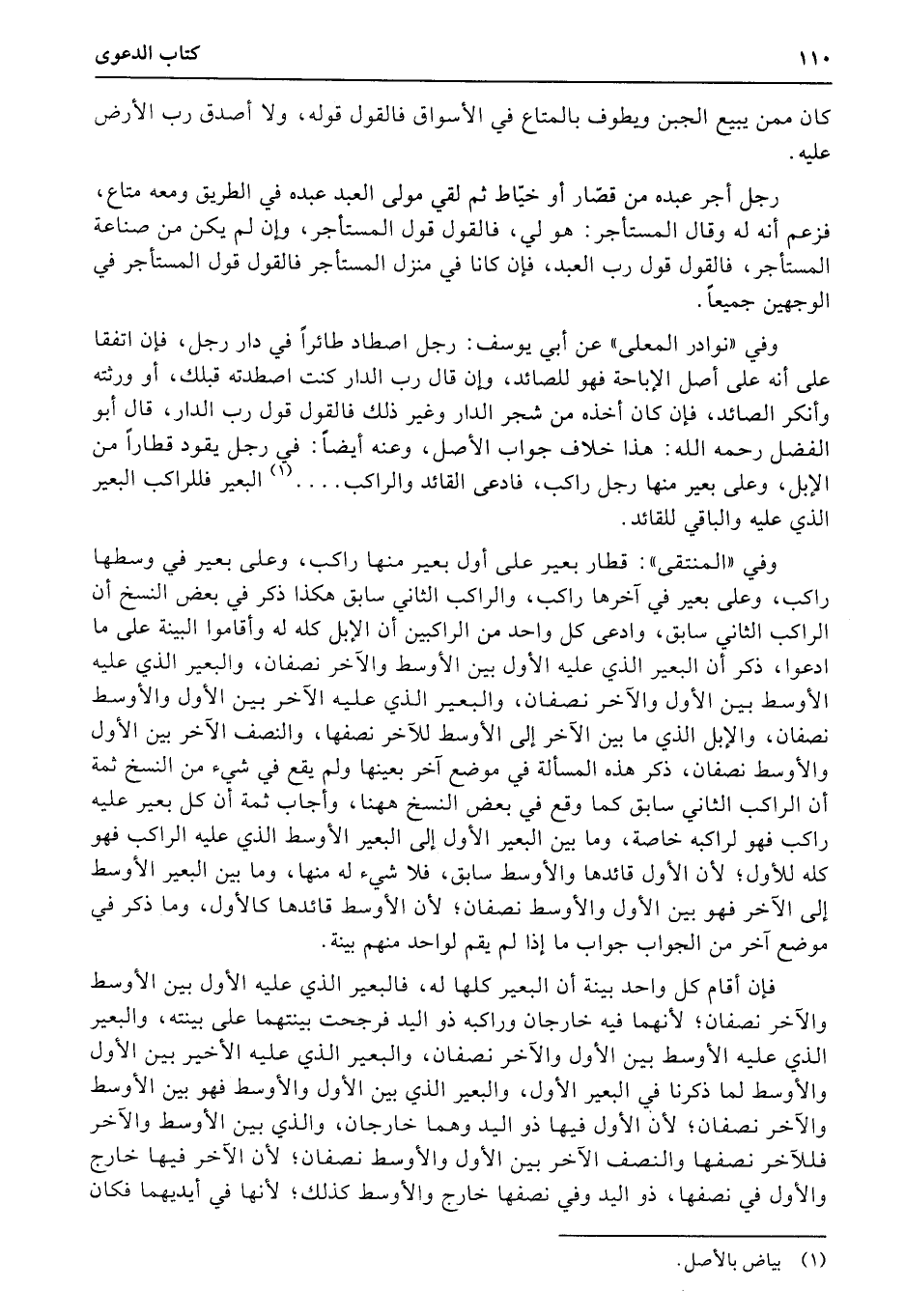 وفي «نوادر المعلى» عن أبي يوسف: رجل اصطاد طائراً في دار رجل، فإن اتفقا على أنه على أصل الإباحة فهو للصائد، وإن قال رب الدار كنت اصطدته قبلك، أو ورثته وأنكر الصائد، فإن كان أخذه من شجر الدار وغير ذلك فالقول قول رب الدار، قال أبو الفضل رحمه الله: هذا خلاف جواب الأصل، وعنه أيضاً: في رجل يقود قطاراً من الإبل، وعلى بعير منها رجل راكب، فادعى القائد والراكب...... البعير فللراكب البعير الذي عليه والباقي للقائد.