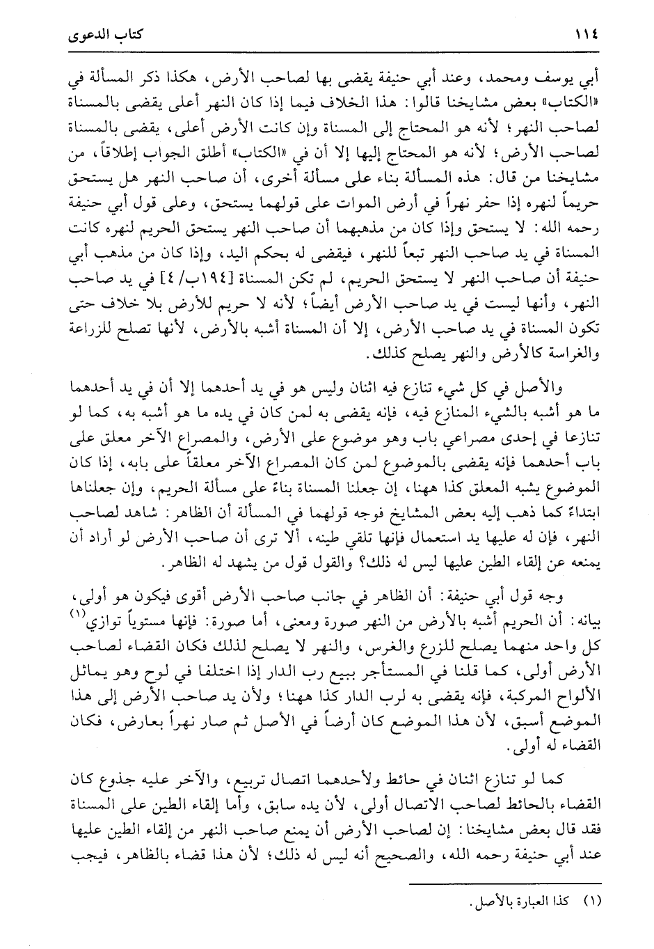 والأصل في كل شيء تنازع فيه اثنان وليس هو في يد أحدهما إلا أن في يد أحدهما ما هو أشبه بالشيء المنازع فيه، فإنه يقضى به لمن كان في يده ما هو أشبه به، كما لو تنازعا في إحدى مصراعي باب وهو موضوع على الأرض، والمصراع الآخر معلق على باب أحدهما فإنه يقضى بالموضوع لمن كان المصراع الآخر معلقاً على بابه، إذا كان الموضوع يشبه المعلق كذا ههنا، إن جعلنا المسناة بناءً على مسألة الحريم، وإن جعلناها ابتداءً كما ذهب إليه بعض المشايخ فوجه قولهما في المسألة أن الظاهر: شاهد لصاحب النهر، فإن له عليها يد استعمال فإنها تلقي طينه، ألا ترى أن صاحب الأرض لو أراد أن يمنعه عن إلقاء الطين عليها ليس له ذلك؟ والقول قول من يشهد له الظاهر.