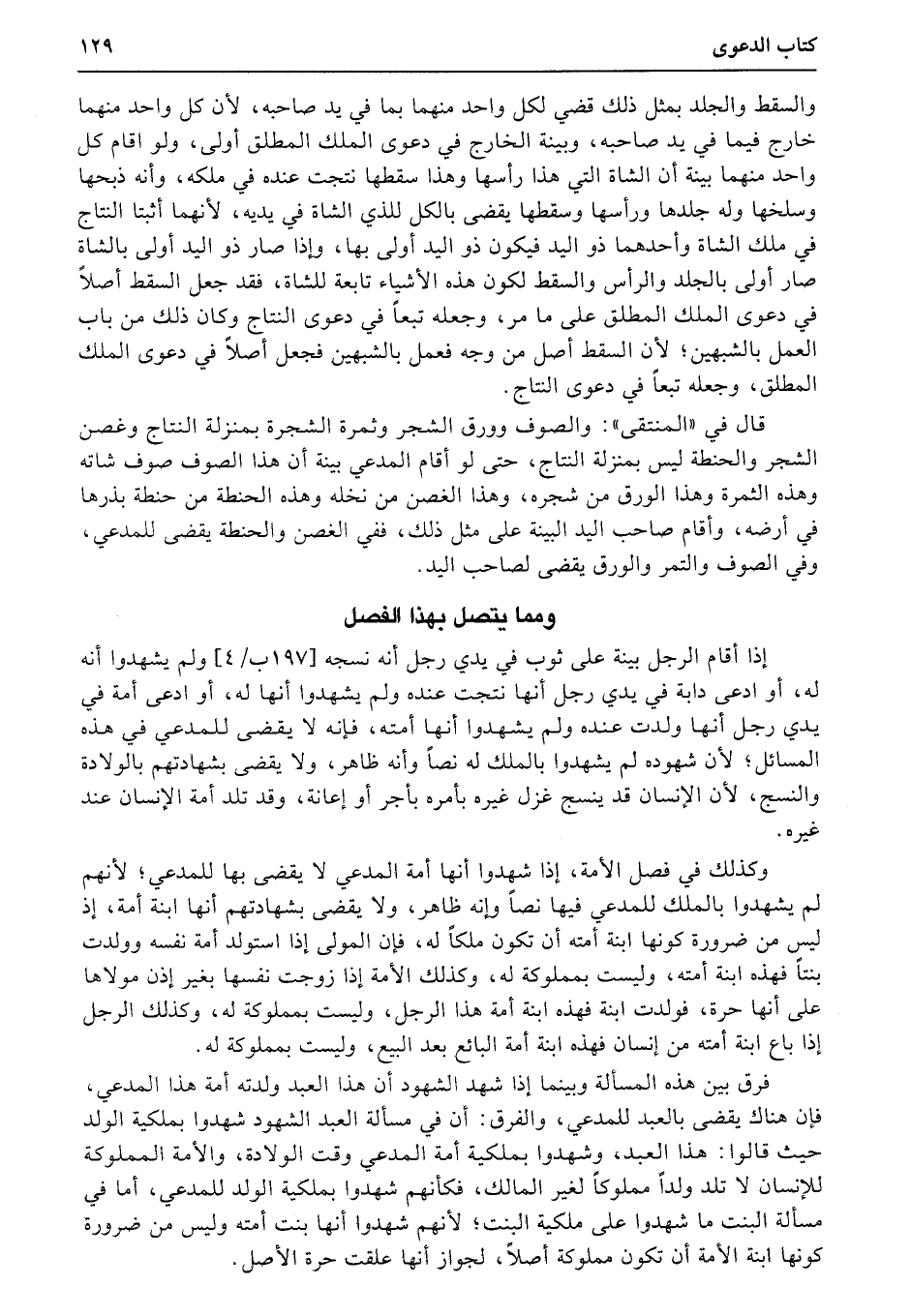 والسقط والجلد بمثل ذلك قضي لكل واحد منهما بما في يد صاحبه، لأن كل واحد منهما خارج فيما في يد صاحبه، وبينة الخارج في دعوى الملك المطلق أولى، ولو اقام كل واحد منهما بينة أن الشاة التي هذا رأسها وهذا سقطها نتجت عنده في ملكه، وأنه ذبحها وسلخها وله جلدها ورأسها وسقطها يقضى بالكل للذي الشاة في يديه، لأنهما أثبتا النتاج في ملك الشاة وأحدهما ذو اليد فيكون ذو اليد أولى بها، وإذا صار ذو اليد أولى بالشاة صار أولى بالجلد والرأس والسقط لكون هذه الأشياء تابعة للشاة، فقد جعل السقط أصلاً في دعوى الملك المطلق على ما مر، وجعله تبعاً في دعوى النتاج وكان ذلك من باب العمل بالشبهين؛ لأن السقط أصل من وجه فعمل بالشبهين فجعل أصلاً في دعوى الملك المطلق، وجعله تبعاً في دعوى النتاج.