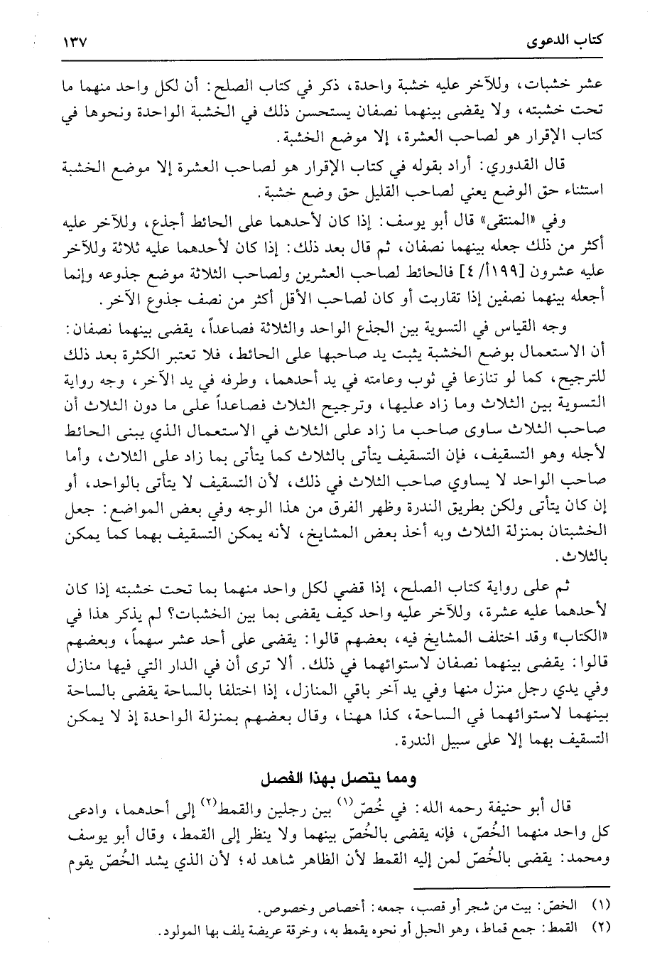 ولو كان لأحدهما عليه عشر خشبات إلى الثلاث وللآخر عليه ما دون الثلاث خشبة أو خشبات، فالحائط لصاحب الثلاث فصاعداً إلى العشرة ولصاحب ما دون الثلاث موضع جذعه مع أصل الحائط، ومعناه أنه يقضى بملك الحائط بينهما على قدر جذوعهما، لا أنه يقضى بملك الحائط لصاحب العشرة وللآخر مجرد حق الوضع، إذ لو كان المراد ذلك لكان يقال: الحائط لصاحب العشرة وللآخر حق وضع الجذع كما قال، وللآخر موضع جذعه مع أهل الحائط، علمنا أنه أراد به أن الحائط بينهما على عدد أجذاعهما، حتى أنه إذا كان لأحدهما عشر جذوع وللآخر جذع واحد يقضى بينهما، وهذا قول أبي حنيفة، وهو قول أبي يوسف، وكان ينبغي في القياس يقضى بينهما، هكذا ذكر الكرخي في «مختصره» ، قال في «النوازل» : وكان أبو حنيفة وأبو يوسف يقولان بالقياس أولاً ثم رجعا عنه.