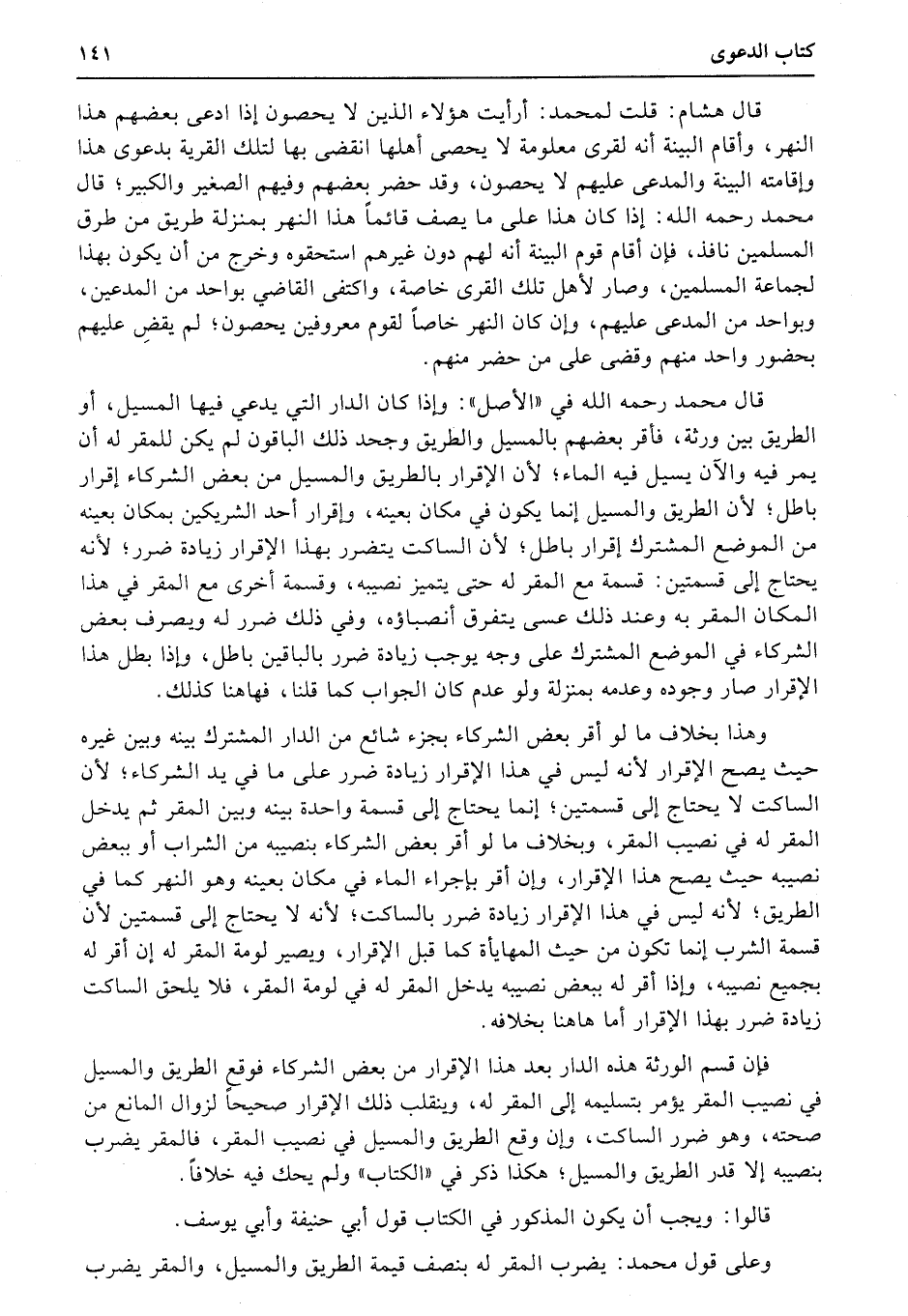 قال هشام: قلت لمحمد: أرأيت هؤلاء الذين لا يحصون إذا ادعى بعضهم هذا النهر، وأقام البينة أنه لقرى معلومة لا يحصى أهلها انقضى بها لتلك القرية بدعوى هذا وإقامته البينة والمدعى عليهم لا يحصون، وقد حضر بعضهم وفيهم الصغير والكبير؛ قال محمد رحمه الله: إذا كان هذا على ما يصف قائماً هذا النهر بمنزلة طريق من طرق المسلمين نافذ، فإن أقام قوم البينة أنه لهم دون غيرهم استحقوه وخرج من أن يكون بهذا لجماعة المسلمين، وصار لأهل تلك القرى خاصة، واكتفى القاضي بواحد من المدعين، وبواحد من المدعى عليهم، وإن كان النهر خاصاً لقوم معروفين يحصون؛ لم يقضِ عليهم بحضور واحد منهم وقضى على من حضر منهم.