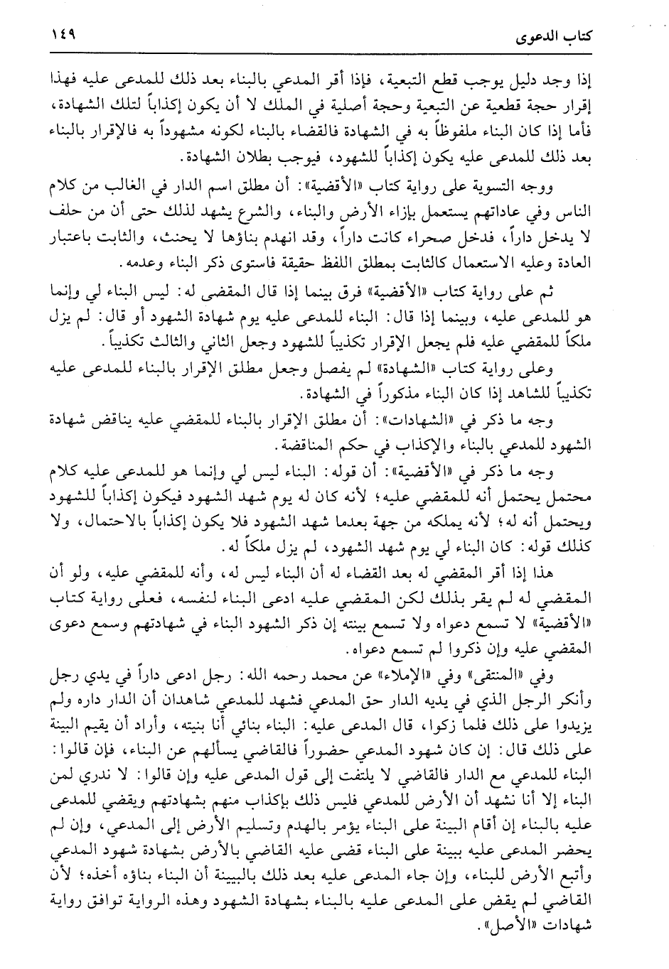 إذا وجد دليل يوجب قطع التبعية، فإذا أقر المدعي بالبناء بعد ذلك للمدعى عليه فهذا إقرار حجة قطعية عن التبعية وحجة أصلية في الملك لا أن يكون إكذاباً لتلك الشهادة، فأما إذا كان البناء ملفوظاً به في الشهادة فالقضاء بالبناء لكونه مشهوداً به فالإقرار بالبناء بعد ذلك للمدعى عليه يكون إكذاباً للشهود، فيوجب بطلان الشهادة.