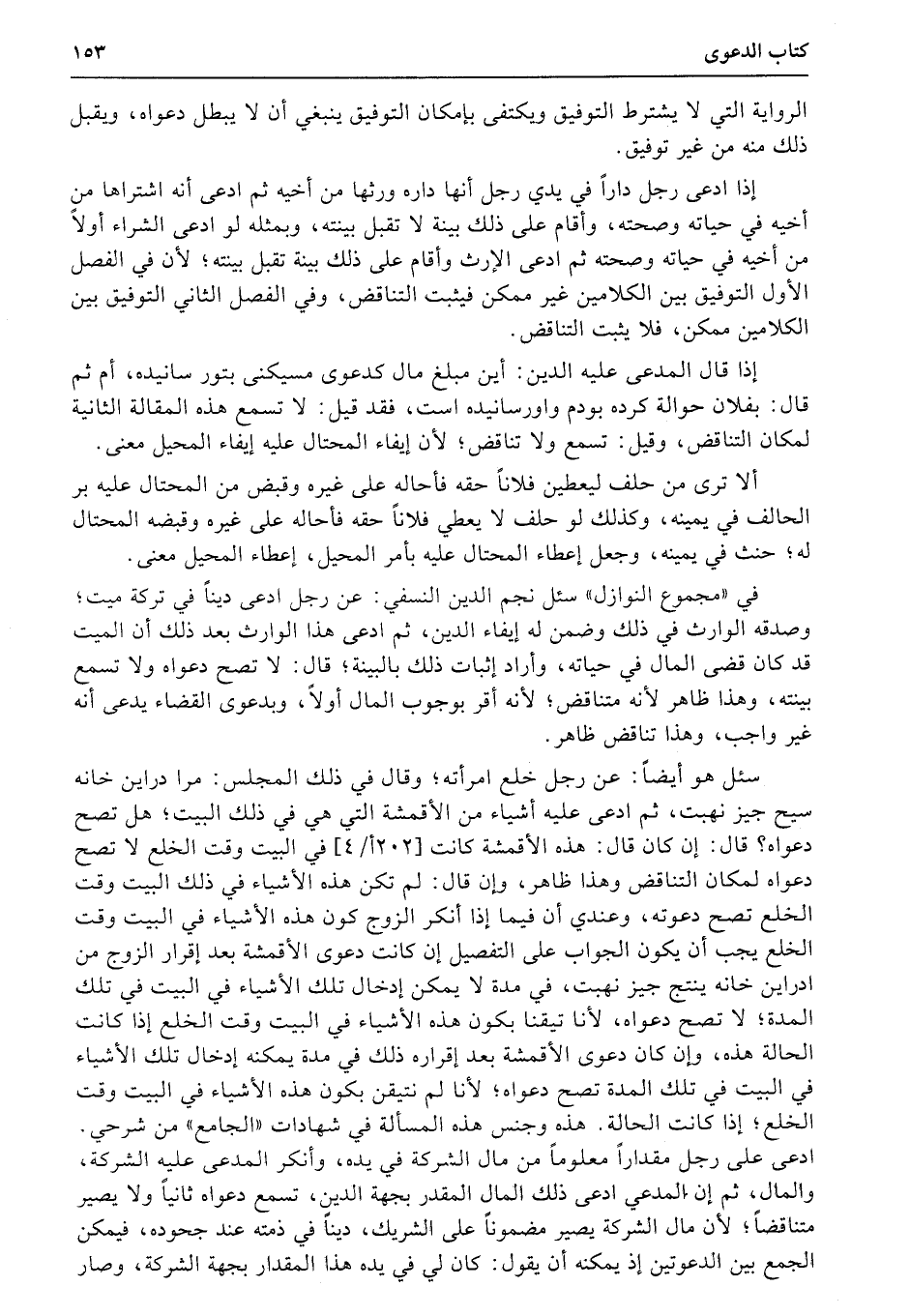 إذا قال المدعى عليه الدين: أين مبلغ مال كدعوى مسيكنى بتور سانيده، أم ثم قال: بفلان حوالة كرده بودم واورسانيده است، فقد قيل: لا تسمع هذه المقالة الثانية لمكان التناقض، وقيل: تسمع ولا تناقض؛ لأن إيفاء المحتال عليه إيفاء المحيل معنى.