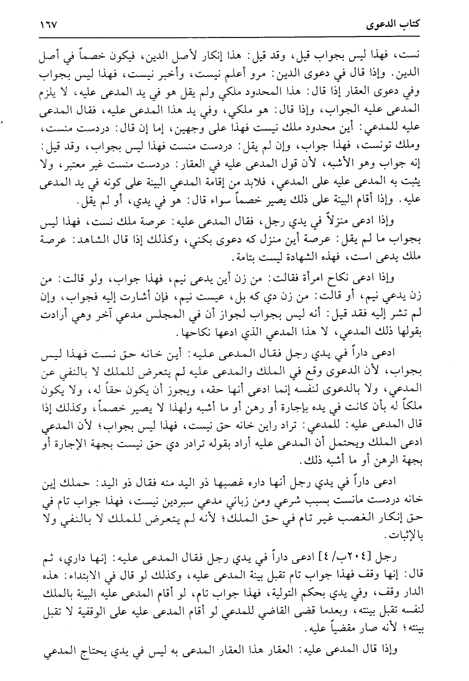 نست، فهذا ليس بجواب قيل، وقد قيل: هذا إنكار لأصل الدين، فيكون خصماً في أصل الدين. وإذا قال في دعوى الدين: مرو أعلم نيست، وأخبر نيست، فهذا ليس بجواب وفي دعوى العقار إذا قال: هذا المحدود ملكي ولم يقل هو في يد المدعى عليه، لا يلزم المدعى عليه الجواب، وإذا قال: هو ملكي، وفي يد هذا المدعى عليه، فقال المدعى عليه للمدعي: أين محدود ملك نيست فهذا على وجهين، إما إن قال: دردست منست، وملك تونست، فهذا جواب، وإن لم يقل: دردست منست فهذا ليس بجواب، وقد قيل: إنه جواب وهو الأشبه، لأن قول المدعى عليه في العقار: دردست منست غير معتبر، ولا يثبت به المدعى عليه على المدعي، فلابد من إقامة المدعي البينة على كونه في يد المدعى عليه. وإذا أقام البينة على ذلك يصير خصماً سواء قال: هو في يدي، أو لم يقل.