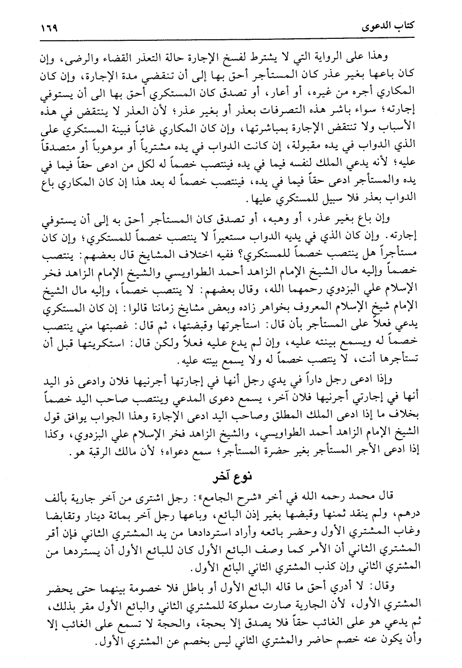 وإذا ادعى رجل داراً في يدي رجل أنها في إجارتها أجرنيها فلان وادعى ذو اليد أنها في إجارتي أجرنيها فلان آخر، يسمع دعوى المدعي وينتصب صاحب اليد خصماً بخلاف ما إذا ادعى الملك المطلق وصاحب اليد ادعى الإجارة وهذا الجواب يوافق قول الشيخ الإمام الزاهد أحمد الطواويسي، والشيخ الزاهد فخر الإسلام علي البزدوي، وكذا إذا ادعى الأجر المستأجر بغير حضرة المستأجر؛ سمع دعواه؛ لأن مالك الرقبة هو.
