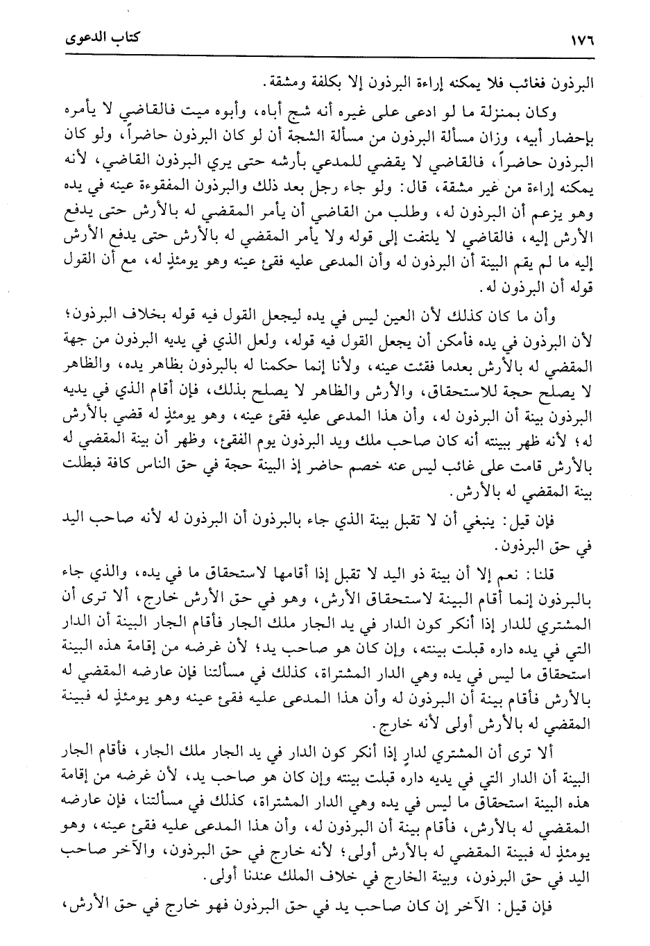 وكان بمنزلة ما لو ادعى على غيره أنه شج أباه، وأبوه ميت فالقاضي لا يأمره بإحضار أبيه، وزان مسألة البرذون من مسألة الشجة أن لو كان البرذون حاضراً، ولو كان البرذون حاضراً، فالقاضي لا يقضي للمدعي بأرشه حتى يري البرذون القاضي، لأنه يمكنه إراءة من غير مشقة، قال: ولو جاء رجل بعد ذلك والبرذون المفقوءة عينه في يده وهو يزعم أن البرذون له، وطلب من القاضي أن يأمر المقضي له بالأرش حتى يدفع الأرش إليه، فالقاضي لا يلتفت إلى قوله ولا يأمر المقضي له بالأرش حتى يدفع الأرش إليه ما لم يقم البينة أن البرذون له وأن المدعى عليه فقئ عينه وهو يومئذٍ له، مع أن القول قوله أن البرذون له.