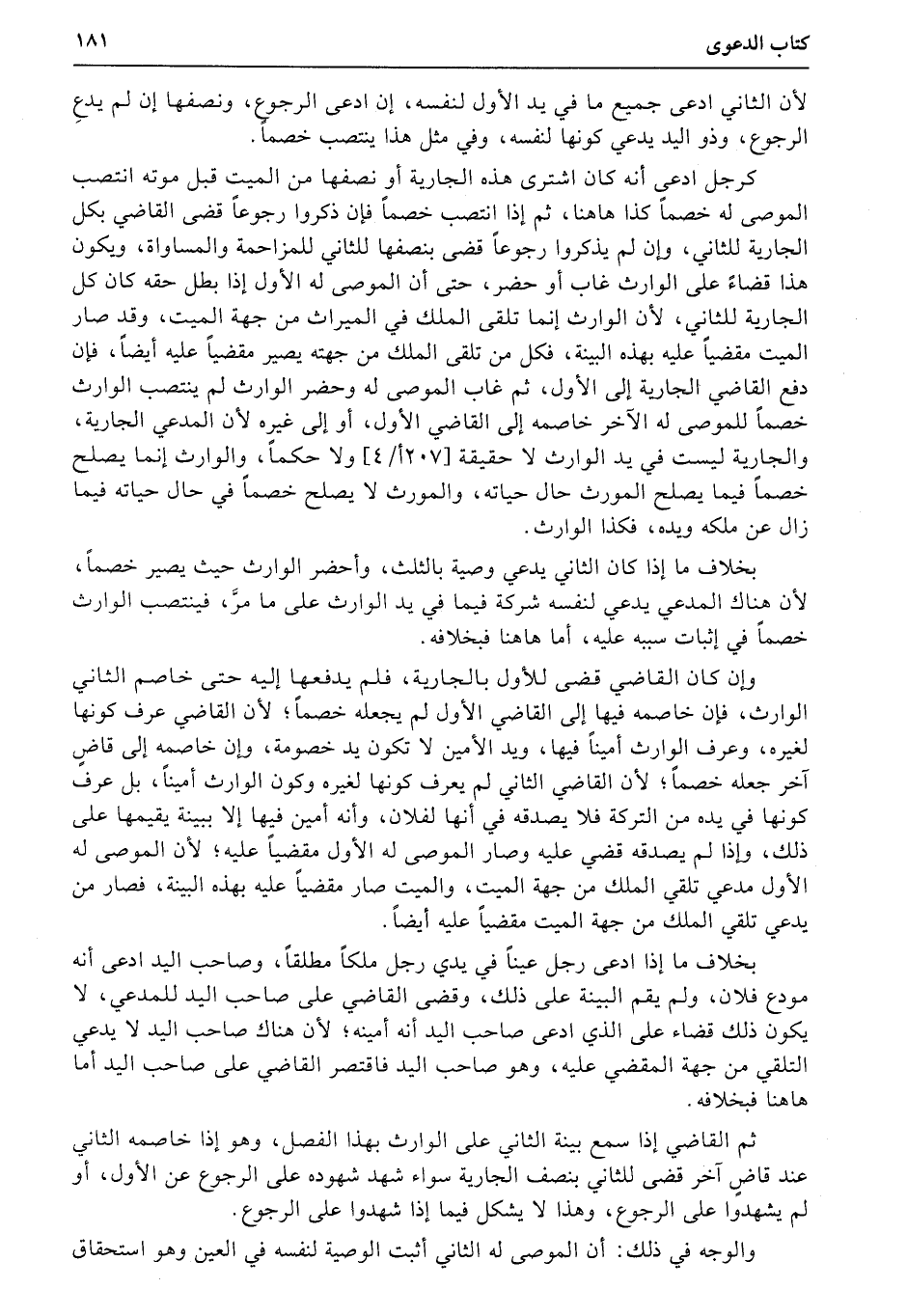 وإن كان القاضي قضى للأول بالجارية، فلم يدفعها إليه حتى خاصم الثاني الوارث، فإن خاصمه فيها إلى القاضي الأول لم يجعله خصماً؛ لأن القاضي عرف كونها لغيره، وعرف الوارث أميناً فيها، ويد الأمين لا تكون يد خصومة، وإن خاصمه إلى قاضٍ آخر جعله خصماً؛ لأن القاضي الثاني لم يعرف كونها لغيره وكون الوارث أميناً، بل عرف كونها في يده من التركة فلا يصدقه في أنها لفلان، وأنه أمين فيها إلا ببينة يقيمها على ذلك، وإذا لم يصدقه قضي عليه وصار الموصى له الأول مقضياً عليه؛ لأن الموصى له الأول مدعي تلقي الملك من جهة الميت، والميت صار مقضياً عليه بهذه البينة، فصار من يدعي تلقي الملك من جهة الميت مقضياً عليه أيضاً.