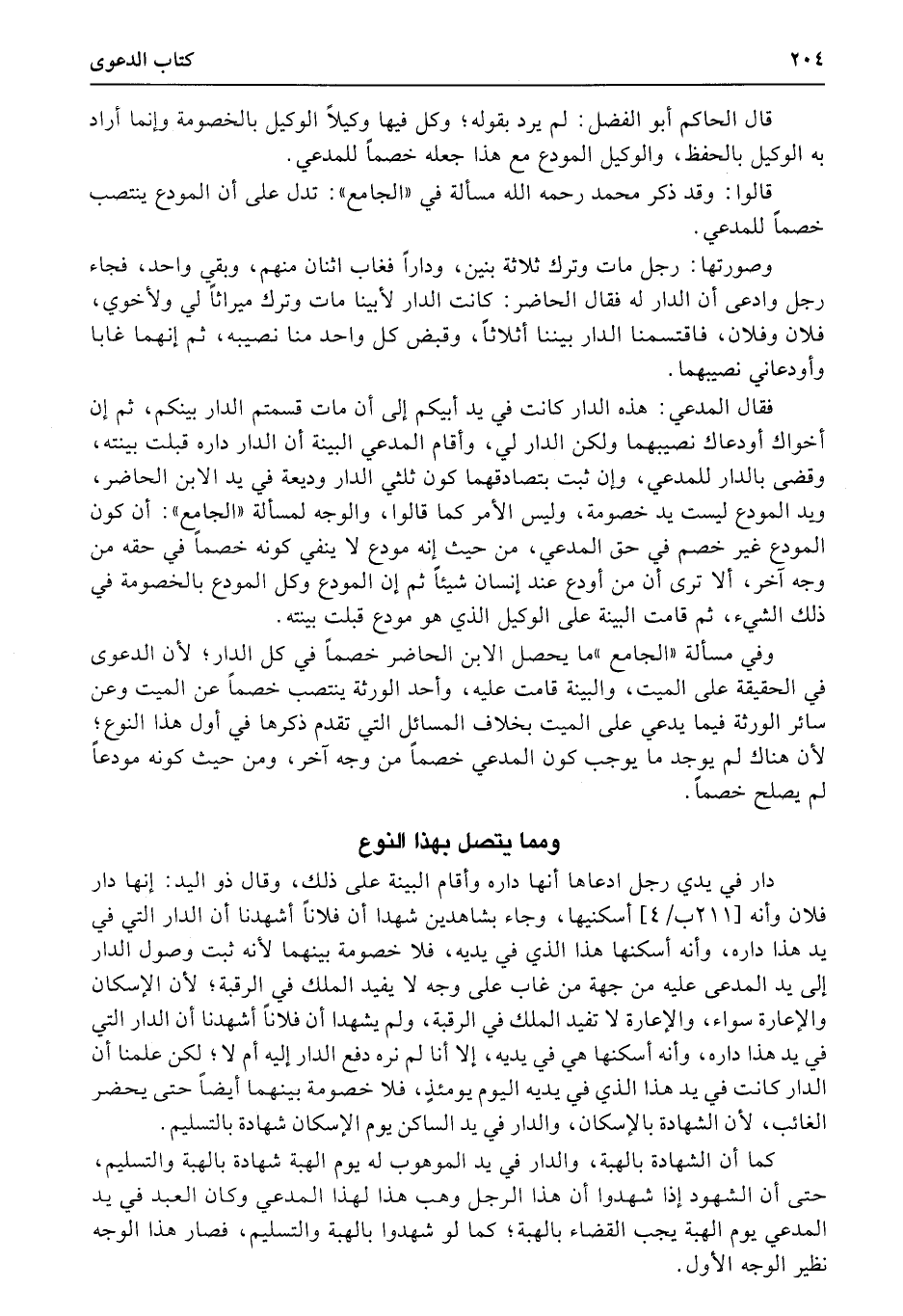 وفي مسألة «الجامع» ما يحصل الابن الحاضر خصماً في كل الدار؛ لأن الدعوى في الحقيقة على الميت، والبينة قامت عليه، وأحد الورثة ينتصب خصماً عن الميت وعن سائر الورثة فيما يدعي على الميت بخلاف المسائل التي تقدم ذكرها في أول هذا النوع؛ لأن هناك لم يوجد ما يوجب كون المدعي خصماً من وجه آخر، ومن حيث كونه مودعاً لم يصلح خصماً.
