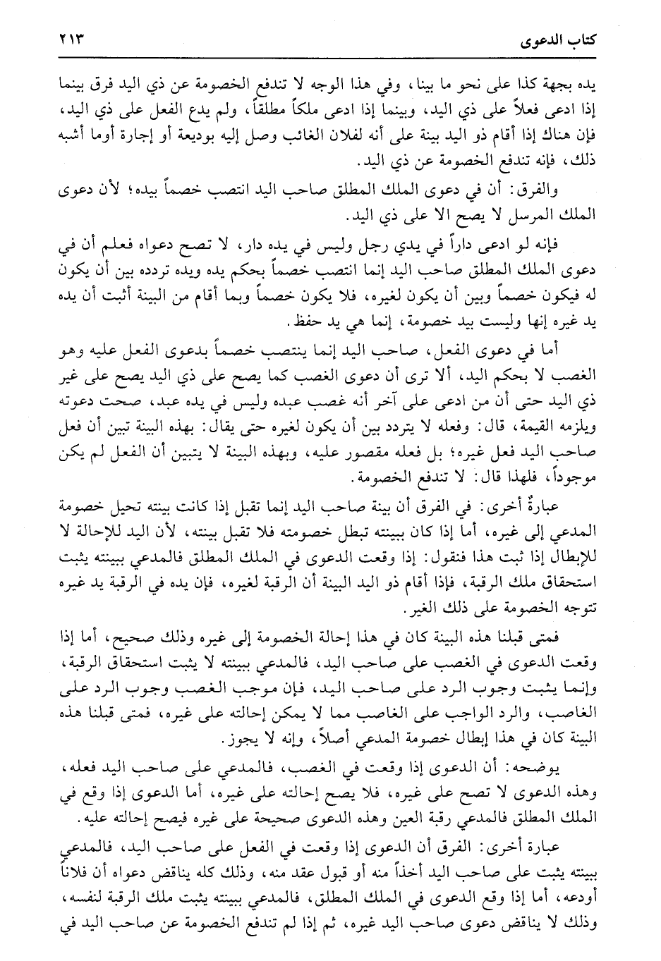 عبارة أخرى: الفرق أن الدعوى إذا وقعت في الفعل على صاحب اليد، فالمدعي ببينته يثبت على صاحب اليد أخذاً منه أو قبول عقد منه، وذلك كله يناقض دعواه أن فلاناً أودعه، أما إذا وقع الدعوى في الملك المطلق، فالمدعي ببينته يثبت ملك الرقبة لنفسه، وذلك لا يناقض دعوى صاحب اليد غيره، ثم إذا لم تندفع الخصومة عن صاحب اليد في
