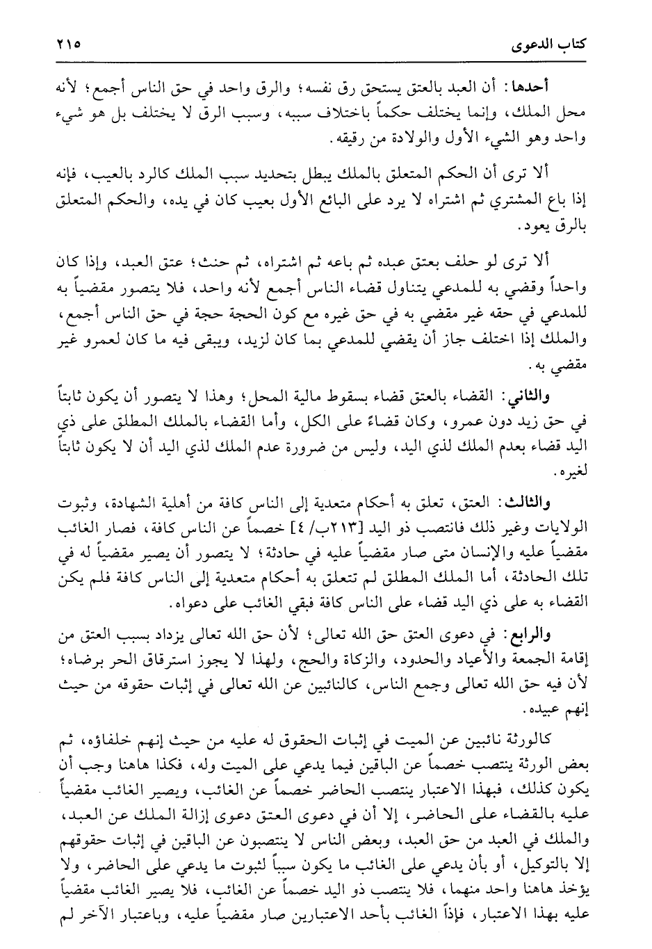والثالث: العتق، تعلق به أحكام متعدية إلى الناس كافة من أهلية الشهادة، وثبوت الولايات وغير ذلك فانتصب ذو اليد (213ب4) خصماً عن الناس كافة، فصار الغائب مقضياً عليه والإنسان متى صار مقضياً عليه في حادثة؛ لا يتصور أن يصير مقضياً له في تلك الحادثة، أما الملك المطلق لم تتعلق به أحكام متعدية إلى الناس كافة فلم يكن القضاء به على ذي اليد قضاء على الناس كافة فبقي الغائب على دعواه.