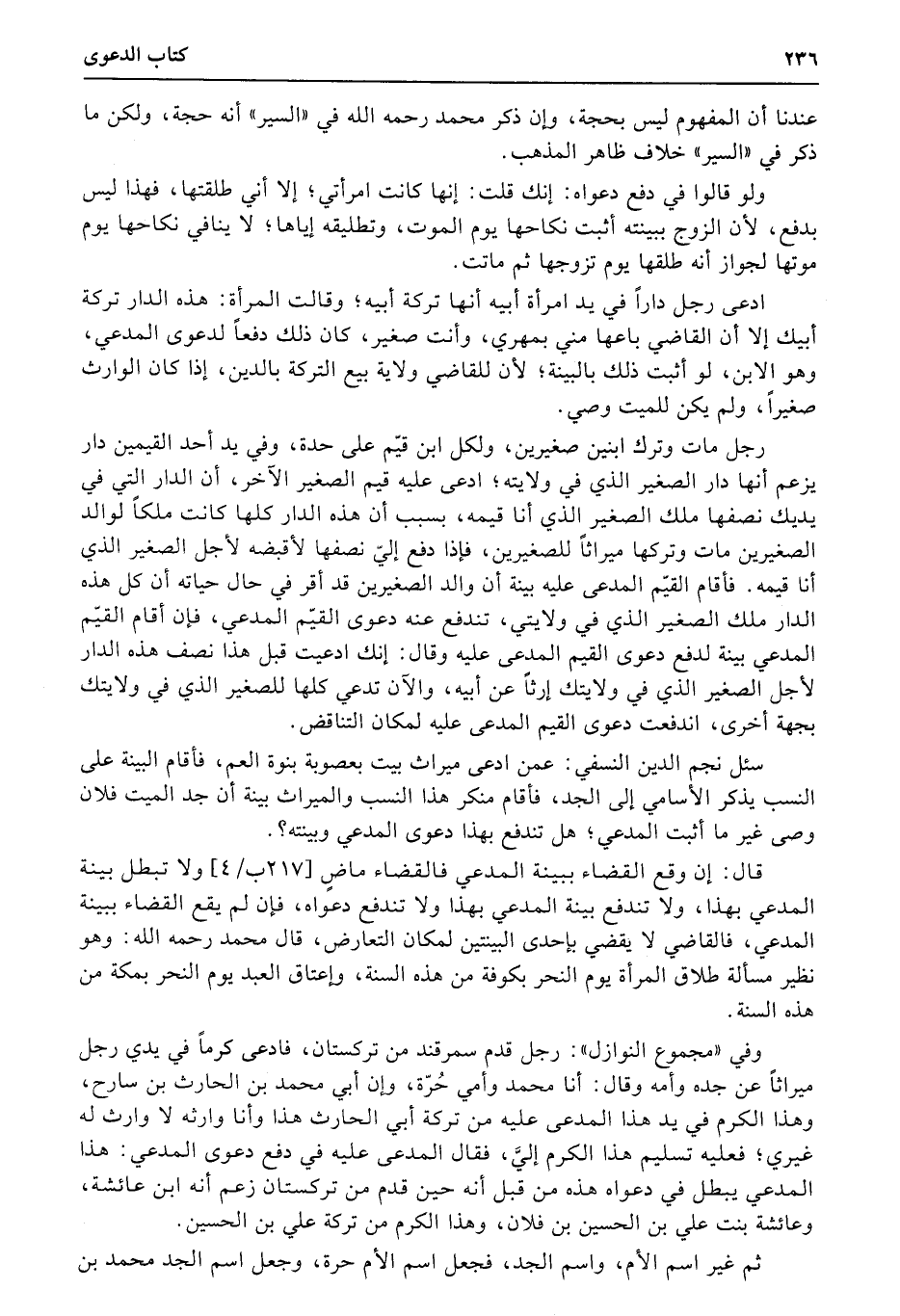وفي «مجموع النوازل» : رجل قدم سمرقند من تركستان، فادعى كرماً في يدي رجل ميراثاً عن جده وأمه وقال: أنا محمد وأمي حُرّة، وإن أبي محمد بن الحارث بن سارح، وهذا الكرم في يد هذا المدعى عليه من تركة أبي الحارث هذا وأنا وارثه لا وارث له غيري؛ فعليه تسليم هذا الكرم إليَّ، فقال المدعى عليه في دفع دعوى المدعي: هذا المدعي يبطل في دعواه هذه من قبل أنه حين قدم من تركستان زعم أنه ابن عائشة، وعائشة بنت علي بن الحسين بن فلان، وهذا الكرم من تركة علي بن الحسين.