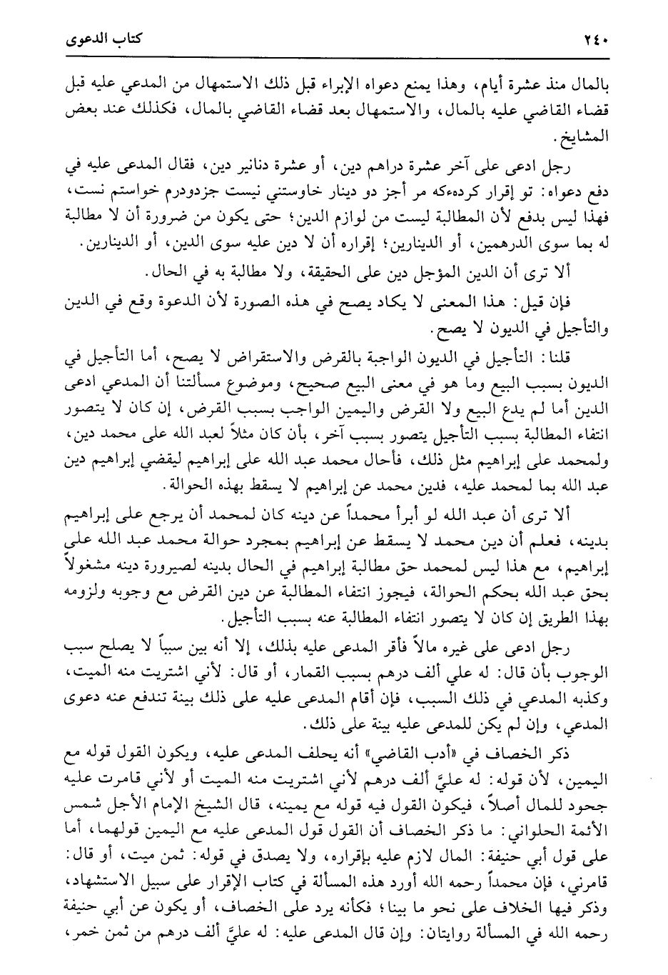 قلنا: التأجيل في الديون الواجبة بالقرض والإستقراض لا يصح، أما التأجيل في الديون بسبب البيع وما هو في معنى البيع صحيح، وموضوع مسألتنا أن المدعي ادعى الدين أما لم يدع البيع ولا القرض واليمين الواجب بسبب القرض، إن كان لا يتصور انتفاء المطالبة بسبب التأجيل يتصور بسبب آخر، بأن كان مثلاً لعبد الله على محمد دين، ولمحمد على إبراهيم مثل ذلك، فأحال محمد عبد الله على إبراهيم ليقضي إبراهيم دين عبد الله بما لمحمد عليه، فدين محمد عن إبراهيم لا يسقط بهذه الحوالة.