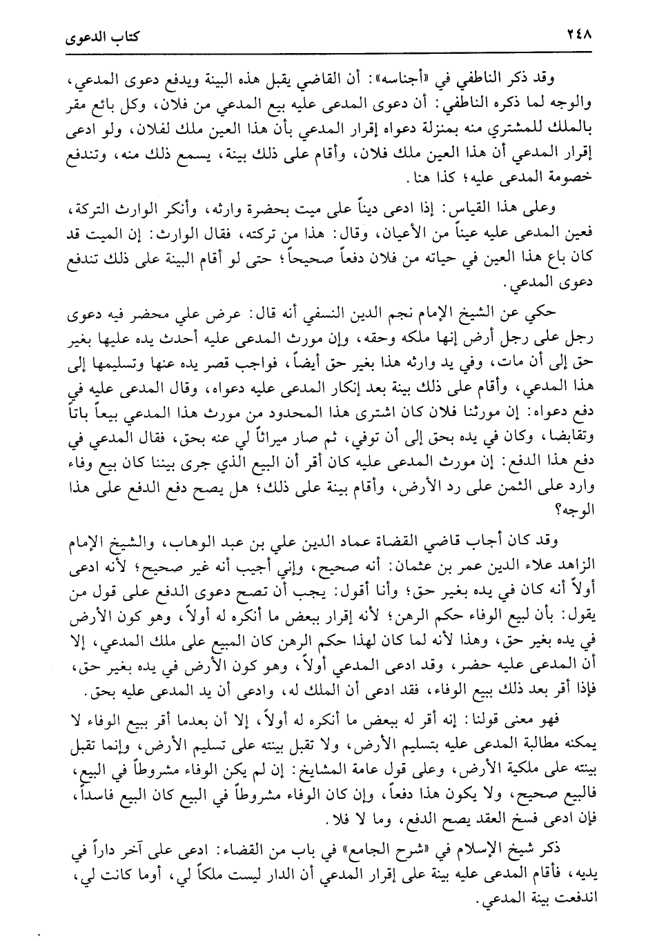 وقد كان أجاب قاضي القضاة عماد الدين علي بن عبد الوهاب، والشيخ الإمام الزاهد علاء الدين عمر بن عثمان: أنه صحيح، وإني أجيب أنه غير صحيح؛ لأنه ادعى أولاً أنه كان في يده بغير حق؛ وأنا أقول: يجب أن تصح دعوى الدفع على قول من يقول: بأن لبيع الوفاء حكم الرهن؛ لأنه إقرار ببعض ما أنكره له أولاً، وهو كون الأرض في يده بغير حق، وهذا لأنه لما كان لهذا حكم الرهن كان المبيع على ملك المدعي، إلا أن المدعى عليه حضر، وقد ادعى المدعي أولاً، وهو كون الأرض في يده بغير حق، فإذا أقر بعد ذلك ببيع الوفاء، فقد ادعى أن الملك له، وادعى أن يد المدعى عليه بحق.