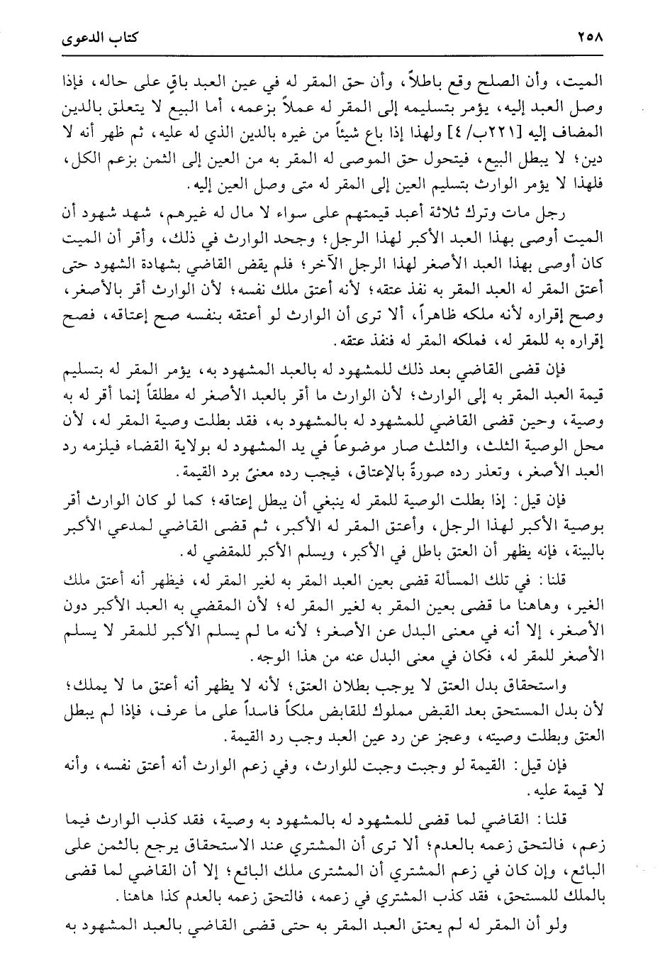 فإن قضى القاضي بعد ذلك للمشهود له بالعبد المشهود به، يؤمر المقر له بتسليم قيمة العبد المقر به إلى الوارث؛ لأن الوارث ما أقر بالعبد الأصغر له مطلقاً إنما أقر له به وصية، وحين قضى القاضي للمشهود له بالمشهود به، فقد بطلت وصية المقر له، لأن محل الوصية الثلث، والثلث صار موضوعاً في يد المشهود له بولاية القضاء فيلزمه رد العبد الأصغر، وتعذر رده صورةً بالإعتاق، فيجب رده معنىً برد القيمة.