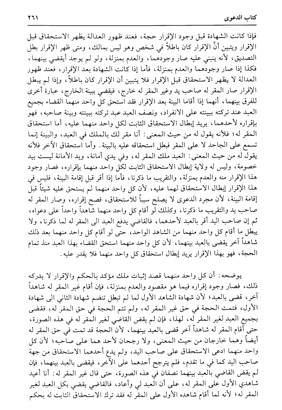 فإذا كانت الشهادة قبل وجود الإقرار حجة، فعند ظهور العدالة يظهر الاستحقاق قبل الإقرار ويتبين أنَّ الإقرار كان باطلاً في شخص وهو ليس بمالك، ومتى ظهر الإقرار بطل التصديق، لأنه ينبني عليه صار وجودهما، والعدم بمنزلة، ولو لم يوجد أيقضي بينهما، فكذا إذا صار وجودهما والعدم بمنزلة، فأما إذا كانت الشهادة بعد الإقرار، فعند ظهور العدالة لا يظهر الاستحقاق قبل الإقرار فلا يتبين أن الإقرار كان باطلاً، وإذا لم يبطل الإقرار صار المقر له صاحب يد وغير المقر له خارج، فيقضي ببينة الخارج، عبارة أخرى للفرق بينهما، أنهما إذا أقاما البينة بعد الإقرار فقد استحق كل واحد منهما القضاء بجميع العبد عند تركته ببينته على الإنفراد، ونصف العبد عبد تركته ببينته وبينة صاحبه، فهو بإقراره لأحدهما، يريد إبطال الاستحقاق الثابت لكل واحد منهما عليه، أما استحقاق المقر له؛ فلأنه يقول له من حيث المعنى: أنا مقر لك بالملك في العبد، والبينة إنما تسمع على الجاحد لا على المقر فبطل استحقاقه عليه بالبينة. وأما استحقاق الآخر فلأنه يقول له من حيث المعنى: العبد ملك المقر له، وفي يدي أمانة، ويد الأمانة ليست بيد خصومة، وليس له ولاية إبطال الاستحقاق الثابت لكل واحد منهما بإقراره، فصاروجود هذا الإقرار منه والعدم بمنزلة، والتقريب ما ذكرنا، فأما إذا أقر قبل إقامة البينة، فليس في هذا الإقرار إبطال الاستحقاق لهما عليه، لأن كل واحد منهما لم يستحق عليه شيئاً قبل إقامة البينة، لأن مجرد الدعوى لا يصلح سبباً للاستحقاق، فصح إقراره، وصار المقر له صاحب يد والتقريب ما ذكرنا، وكذلك لو أقام كل واحد منهما شاهداً واحداً على دعواه، ثم إن صاحب اليد أقر بالعبد لأحدهما، فالقاضي يدفع العبد الى المقر له لما