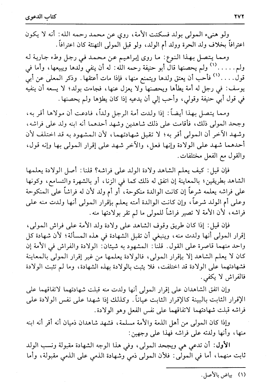 فإن قيل: إذا كان طريق وقوف الشاهد (على) ولادة ولد الأمة على فراش المولى، إقرار المولى أنها ولدت منه، وينبغي أن تقبل الشهادة في هذه المسألة؛ لأن شهادة كل واحد منهما قاصرة على القول. قلنا: المشهود به شيئان: الولادة والفراش في الأمة إن كان لا يعلم الشاهد إلا بإقرار المولى، فالولادة يعلمها من غير إقرار المولى بالمعاينة فشهادتهما على الولادة قد اختلف، فلا يثبت بالولادة بهذه الشهادة، وما لم تثبت الولادة فالفراش لا يكفي.