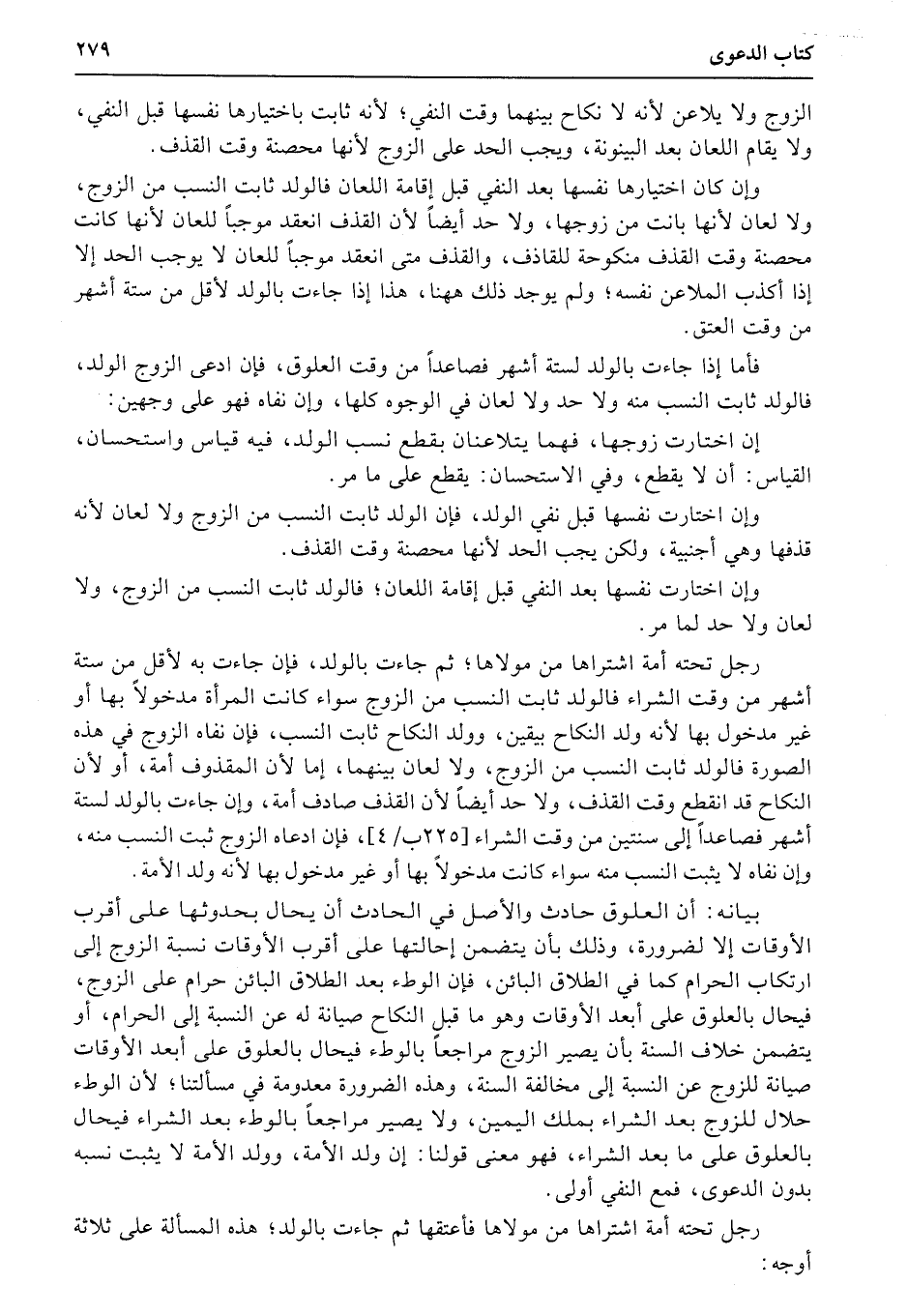بيانه: أن العلوق حادث والأصل في الحادث أن يحال بحدوثها على أقرب الأوقات إلا لضرورة، وذلك بأن يتضمن إحالتها على أقرب الأوقات نسبة الزوج إلى ارتكاب الحرام كما في الطلاق البائن، فإن الوطء بعد الطلاق البائن حرام على الزوج، فيحال بالعلوق على أبعد الأوقات وهو ما قبل النكاح صيانة له عن النسبة إلى الحرام، أو يتضمن خلاف السنة بأن يصير الزوج مراجعاً بالوطء فيحال بالعلوق على أبعد الأوقات صيانة للزوج عن النسبة إلى مخالفة السنة، وهذه الضرورة معدومة في مسألتنا؛ لأن الوطء حلال للزوج بعد الشراء بملك اليمين، ولا يصير مراجعاً بالوطء بعد الشراء فيحال بالعلوق على ما بعد الشراء، فهو معنى قولنا: إن ولد الأمة، وولد الأمة لا يثبت نسبه بدون الدعوى، فمع النفي أولى.