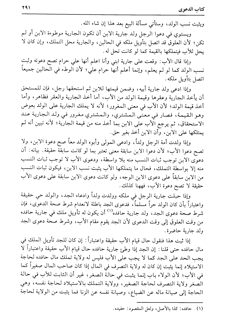 وإذا حبلت جارية الرجل في ملكه وولدت ولداً وادعاه الجد، والولد حي حقيقة واعتباراً بأن كان الولد حراً مسلماً، فدعوى الجد باطلة لانعدام شرط صحة الدعوى، فإن شرط صحة دعوى الجد، ولد جارية حافده أن يكون له تأويل ملك في جارية حافده من وقت العلوق إلى وقت الدعوى لأن الجد يقوم مقام الأب، وشرط صحة دعوى الجد ولد جارية حاضرة.