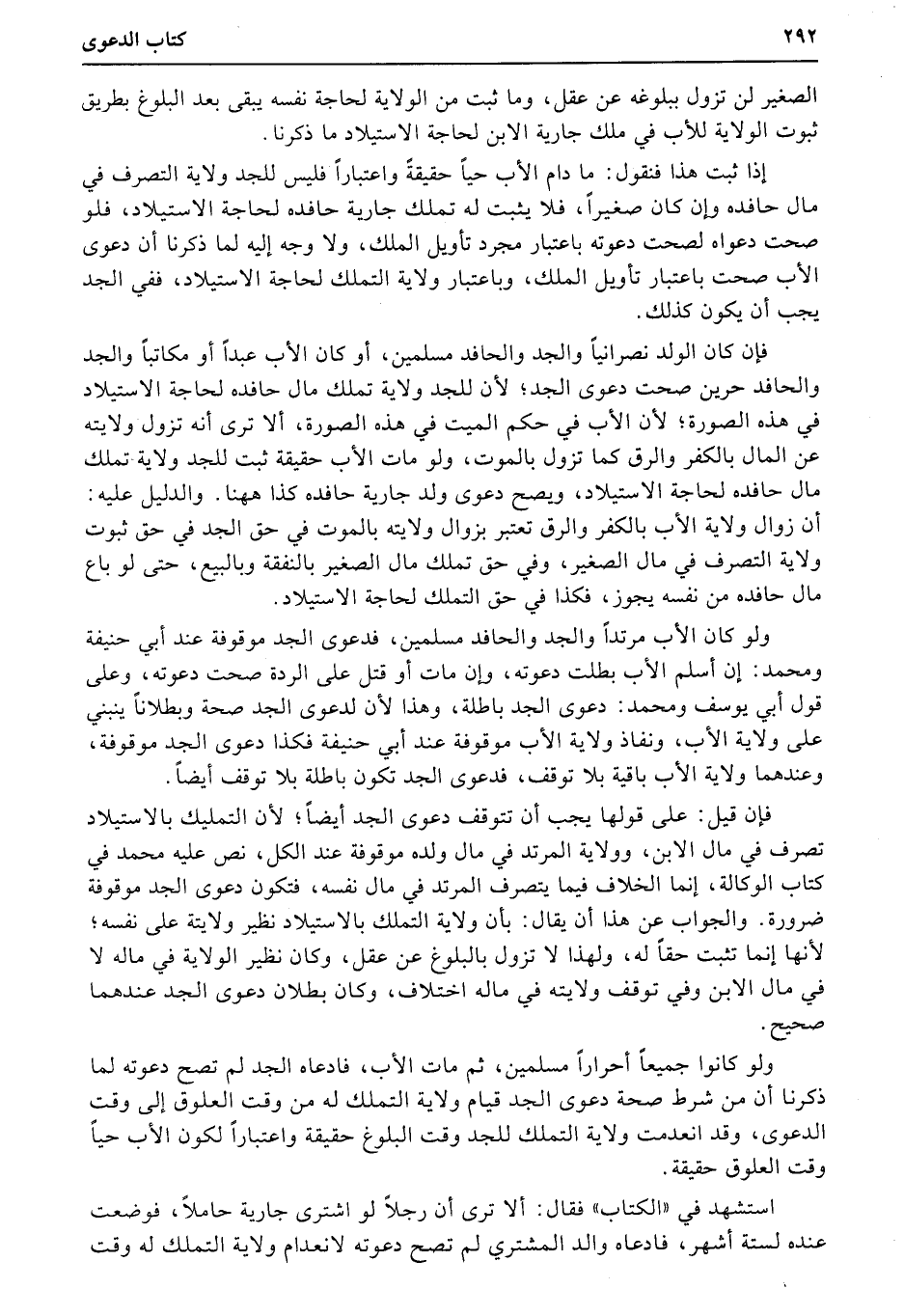 ولو كان الأب مرتداً والجد والحافد مسلمين، فدعوى الجد موقوفة عند أبي حنيفة ومحمد: إن أسلم الأب بطلت دعوته، وإن مات أو قتل على الردة صحت دعوته، وعلى قول أبي يوسف ومحمد: دعوى الجد باطلة، وهذا لأن لدعوى الجد صحة وبطلاناً ينبني على ولاية الأب، ونفاذ ولاية الأب موقوفة عند أبي حنيفة فكذا دعوى الجد موقوفة، وعندهما ولاية الأب باقية بلا توقف، فدعوى الجد تكون باطلة بلا توقف أيضاً.