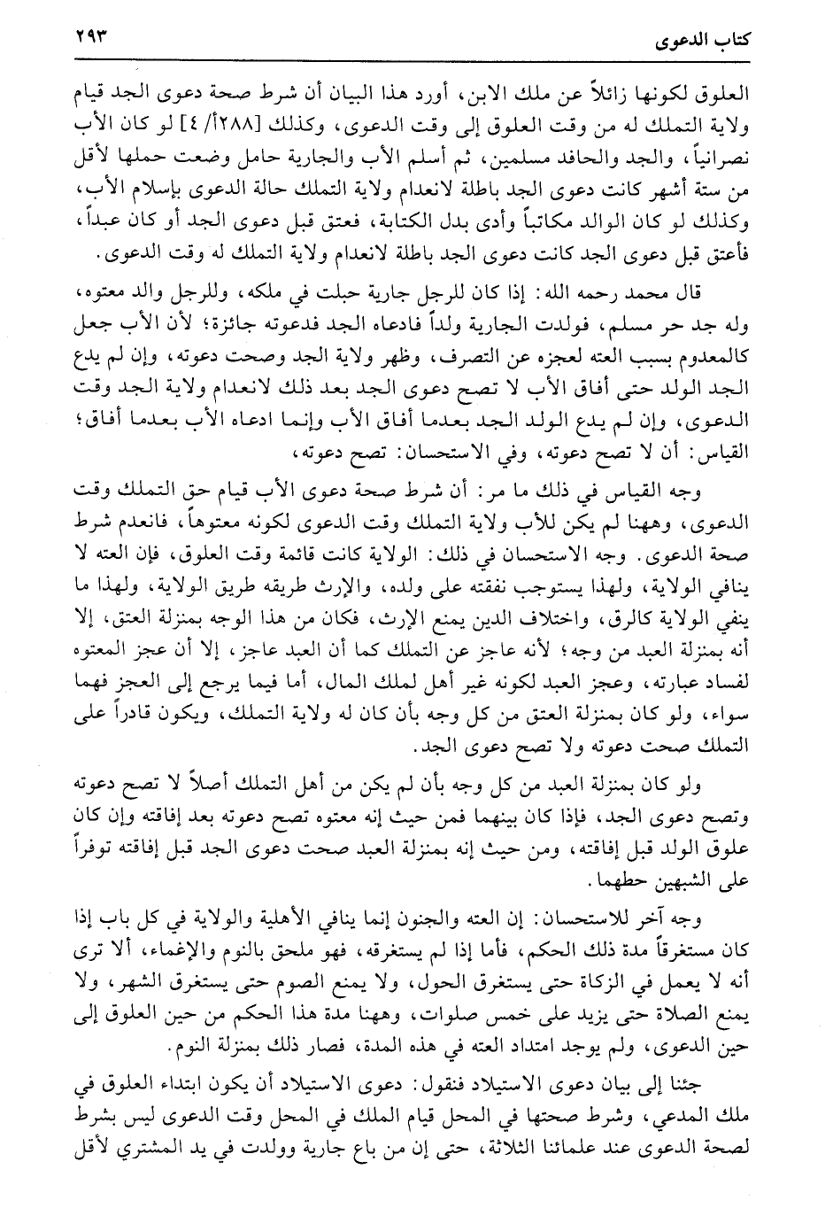 العلوق لكونها زائلاً عن ملك الابن، أورد هذا البيان أن شرط صحة دعوى الجد قيام ولاية التملك له من وقت العلوق إلى وقت الدعوى، وكذلك (288أ4) لو كان الأب نصرانياً، والجد والحافد مسلمين، ثم أسلم الأب والجارية حامل وضعت حملها لأقل من ستة أشهر كانت دعوى الجد باطلة لانعدام ولاية التملك حالة الدعوى بإسلام الأب، وكذلك لو كان الوالد مكاتباً وأدى بدل الكتابة، فعتق قبل دعوى الجد أو كان عبداً، فأعتق قبل دعوى الجد كانت دعوى الجد باطلة لانعدام ولاية التملك له وقت الدعوى.