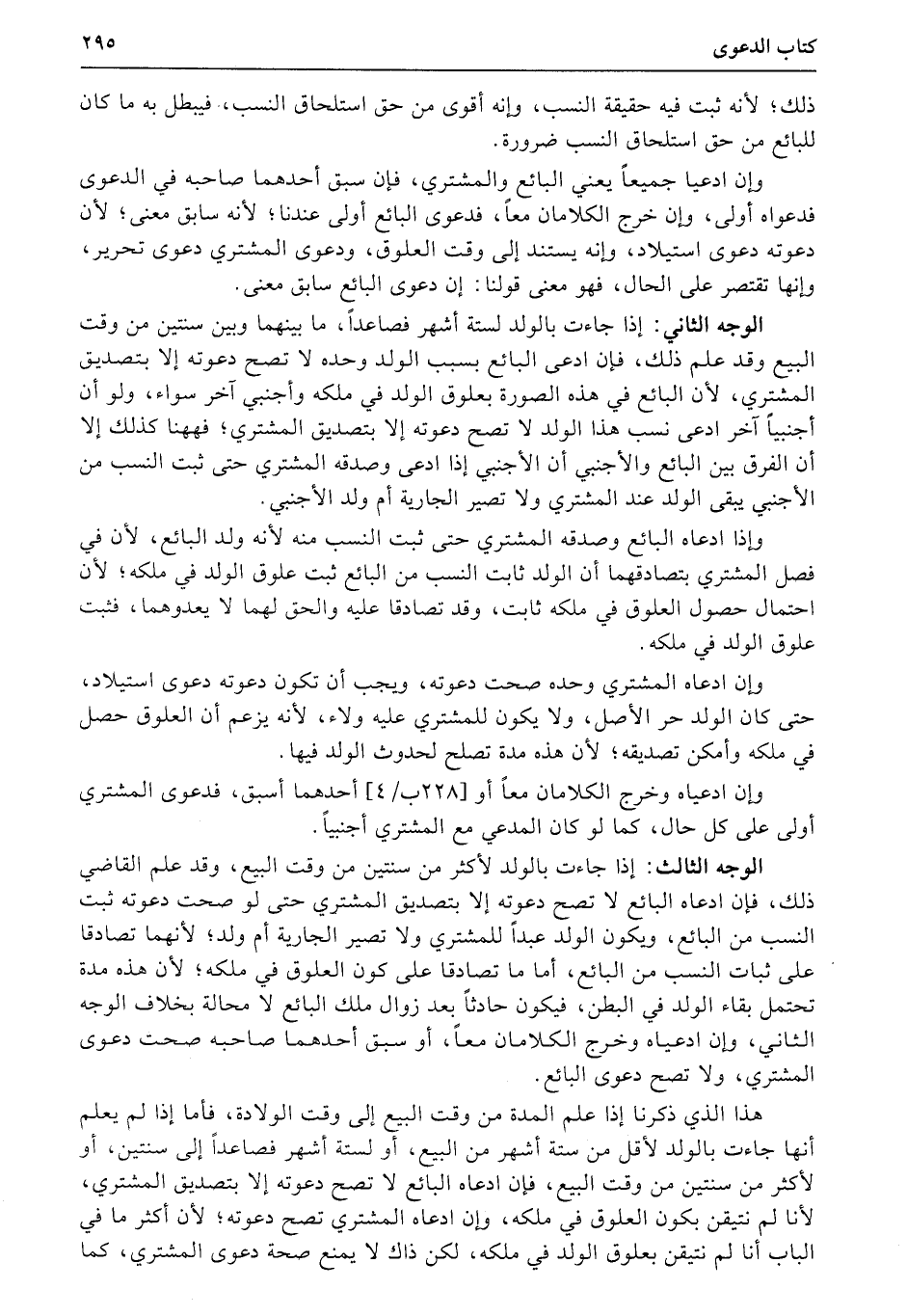 الوجه الثالث: إذا جاءت بالولد لأكثر من سنتين من وقت البيع، وقد علم القاضي ذلك، فإن ادعاه البائع لا تصح دعوته إلا بتصديق المشتري حتى لو صحت دعوته ثبت النسب من البائع، ويكون الولد عبداً للمشتري ولا تصير الجارية أم ولد؛ لأنهما تصادقا على ثبات النسب من البائع، أما ما تصادقا على كون العلوق في ملكه؛ لأن هذه مدة تحتمل بقاء الولد في البطن، فيكون حادثاً بعد زوال ملك البائع لا محالة بخلاف الوجه الثاني، وإن ادعياه وخرج الكلامان معاً، أو سبق أحدهما صاحبه صحت دعوى المشتري، ولا تصح دعوى البائع.