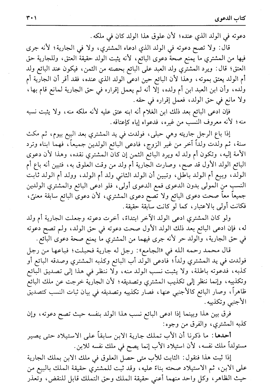 إذا باع الرجل جاريته وهي حبلى، فولدت في يد المشتري بعد البيع بيوم، ثم مكث سنة، ثم ولدت ولداً آخر من غير الزوج، فادعى البائع الولدين جميعاً، فهما ابناه وترد الأمة إليه، وتكون أم ولد له ويرد البائع الثمن إن كان المشتري نقده، وهذا لأن دعوى البائع الولد الأول قد صح، وصارت الجارية أم ولد من وقت العلوق به، فتبين أنه باع أم الولد، وبيع أم الولد باطل، وتبين أن الولد الثاني ولد أم الولد، وولد أم الولد ثابت النسب من المولى بدون الدعوى فمع الدعوى أولى، فلو ادعى البائع والمشتري الولدين جميعاً معاً صحت دعوى البائع ولا تصح دعوى المشتري، لأن دعوى البائع سابقة معنىً، فكانت أولى بالاعتبار، كما لو كانت سابقة حقيقة.