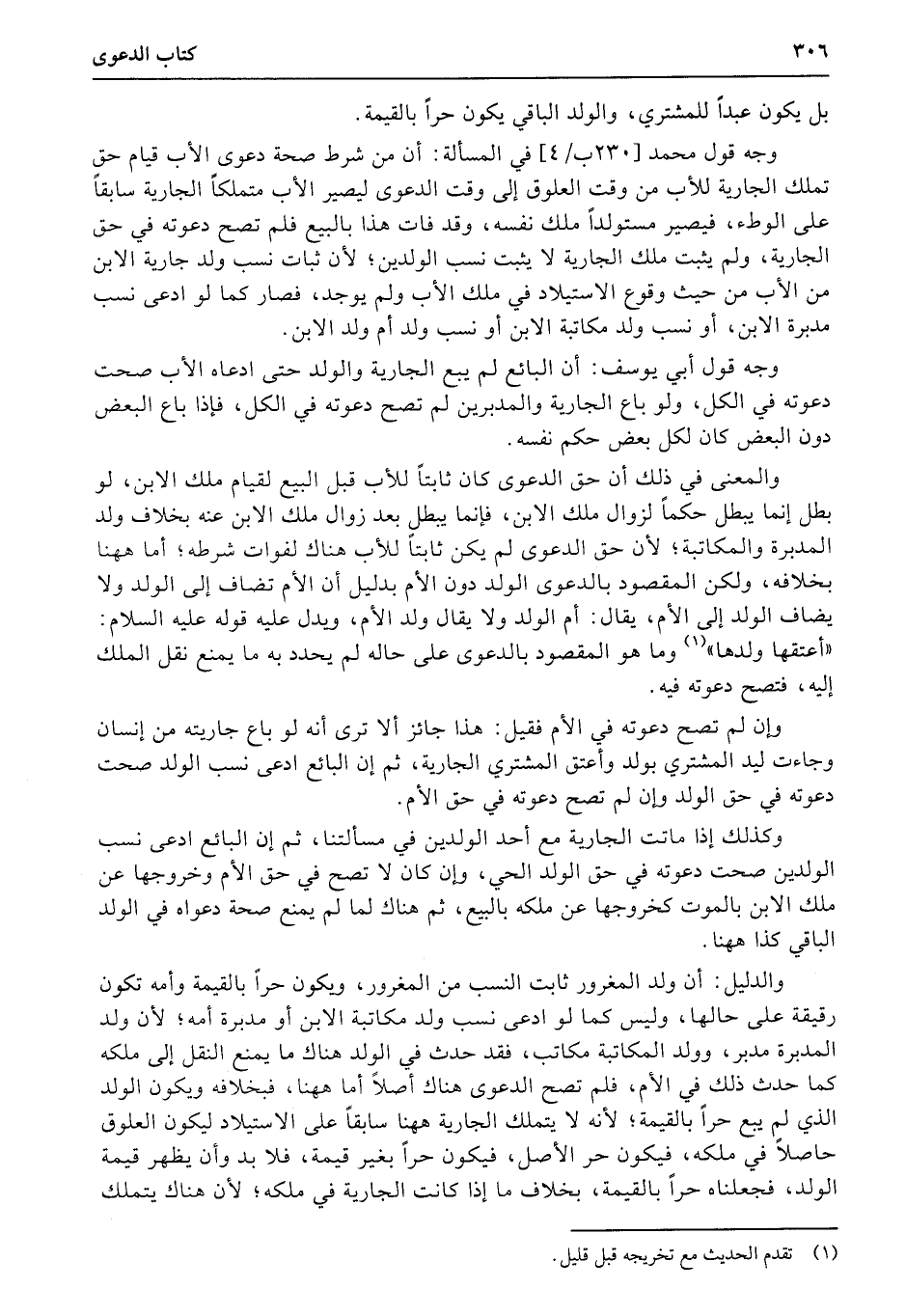 والمعنى في ذلك أن حق الدعوى كان ثابتاً للأب قبل البيع لقيام ملك الابن، لو بطل إنما يبطل حكماً لزوال ملك الابن، فإنما يبطل بعد زوال ملك الابن عنه بخلاف ولد المدبرة والمكاتبة؛ لأن حق الدعوى لم يكن ثابتاً للأب هناك لفوات شرطه؛ أما ههنا بخلافه، ولكن المقصود بالدعوى الولد دون الأم بدليل أن الأم تضاف إلى الولد ولا يضاف الولد إلى الأم، يقال: أم الولد ولا يقال ولد الأم، ويدل عليه قوله عليه السلام: «أعتقها ولدها» وما هو المقصود بالدعوى على حاله لم يحدد به ما يمنع نقل الملك إليه، فتصح دعوته فيه.