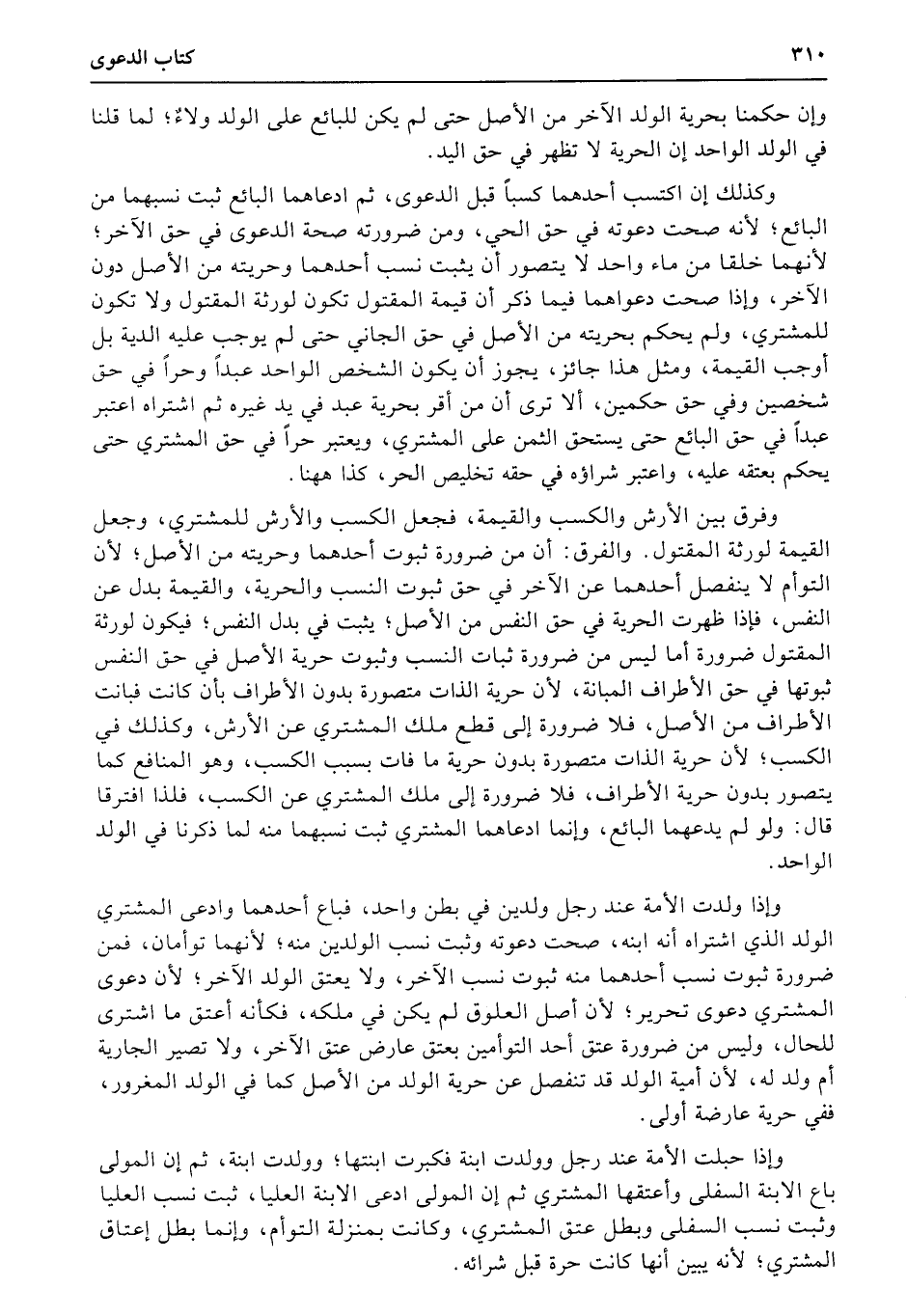 وإذا ولدت الأمة عند رجل ولدين في بطن واحد، فباع أحدهما وادعى المشتري الولد الذي اشتراه أنه ابنه، صحت دعوته وثبت نسب الولدين منه؛ لأنهما توأمان، فمن ضرورة ثبوت نسب أحدهما منه ثبوت نسب الآخر، ولا يعتق الولد الآخر؛ لأن دعوى المشتري دعوى تحرير؛ لأن أصل العلوق لم يكن في ملكه، فكأنه أعتق ما اشترى للحال، وليس من ضرورة عتق أحد التوأمين بعتق عارض عتق الآخر، ولا تصير الجارية أم ولد له، لأن أمية الولد قد تنفصل عن حرية الولد من الأصل كما في الولد المغرور، ففي حرية عارضة أولى.