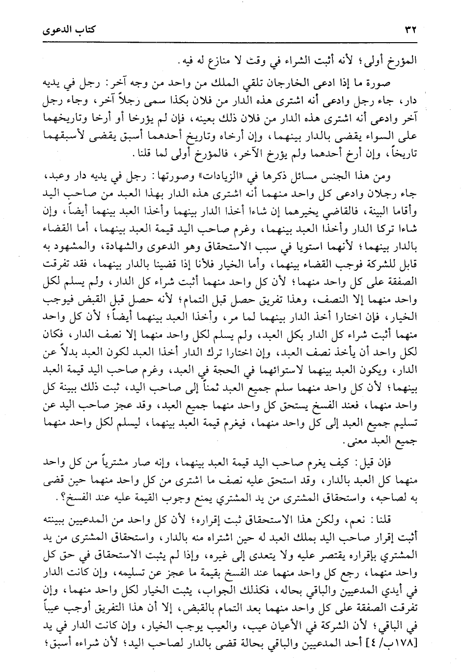 رجل في يديه دار، جاء رجل وادعى أنه اشترى هذه الدار من فلان بكذا سمى رجلاً آخر، وجاء رجل آخر وادعى أنه اشترى هذه الدار من فلان ذلك بعينه، فإن لم يؤرخا أو أرخا وتاريخهما على السواء يقضى بالدار بينهما، وإن أرخاه وتاريخ أحدهما أسبق يقضى لأسبقهما تاريخاً، وإن أرخ أحدهما ولم يؤرخ الآخر، فالمؤرخ أولى لما قلنا.