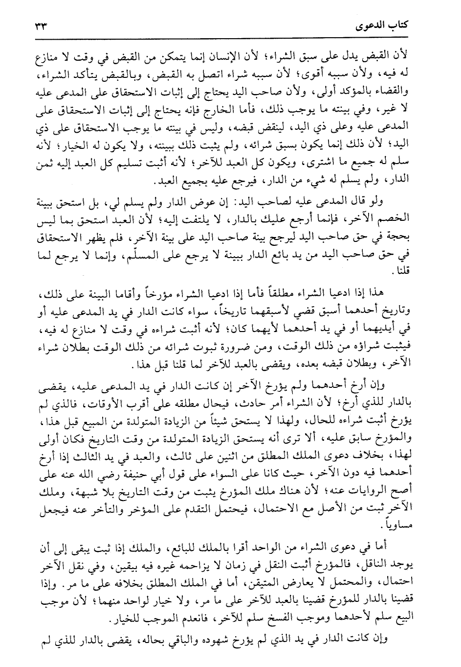 وإن أرخ أحدهما ولم يؤرخ الآخر إن كانت الدار في يد المدعى عليه، يقضى بالدار للذي أرخ؛ لأن الشراء أمر حادث، فيحال مطلقه على أقرب الأوقات، فالذي لم يؤرخ أثبت شراءه للحال، ولهذا لا يستحق شيئاً من الزيادة المتولدة من المبيع قبل هذا، والمؤرخ سابق عليه، ألا ترى أنه يستحق الزيادة المتولدة من وقت التاريخ فكان أولى لهذا، بخلاف دعوى الملك المطلق من اثنين على ثالث، والعبد في يد الثالث إذا أرخ أحدهما فيه دون الآخر، حيث كانا على السواء على قول أبي حنيفة رضي الله عنه على أصح الروايات عنه؛ لأن هناك ملك المؤرخ يثبت من وقت التاريخ بلا شبهة، وملك الآخر ثبت من الأصل مع الاحتمال، فيحتمل التقدم على المؤخر والتأخر عنه فيجعل مساوياً.