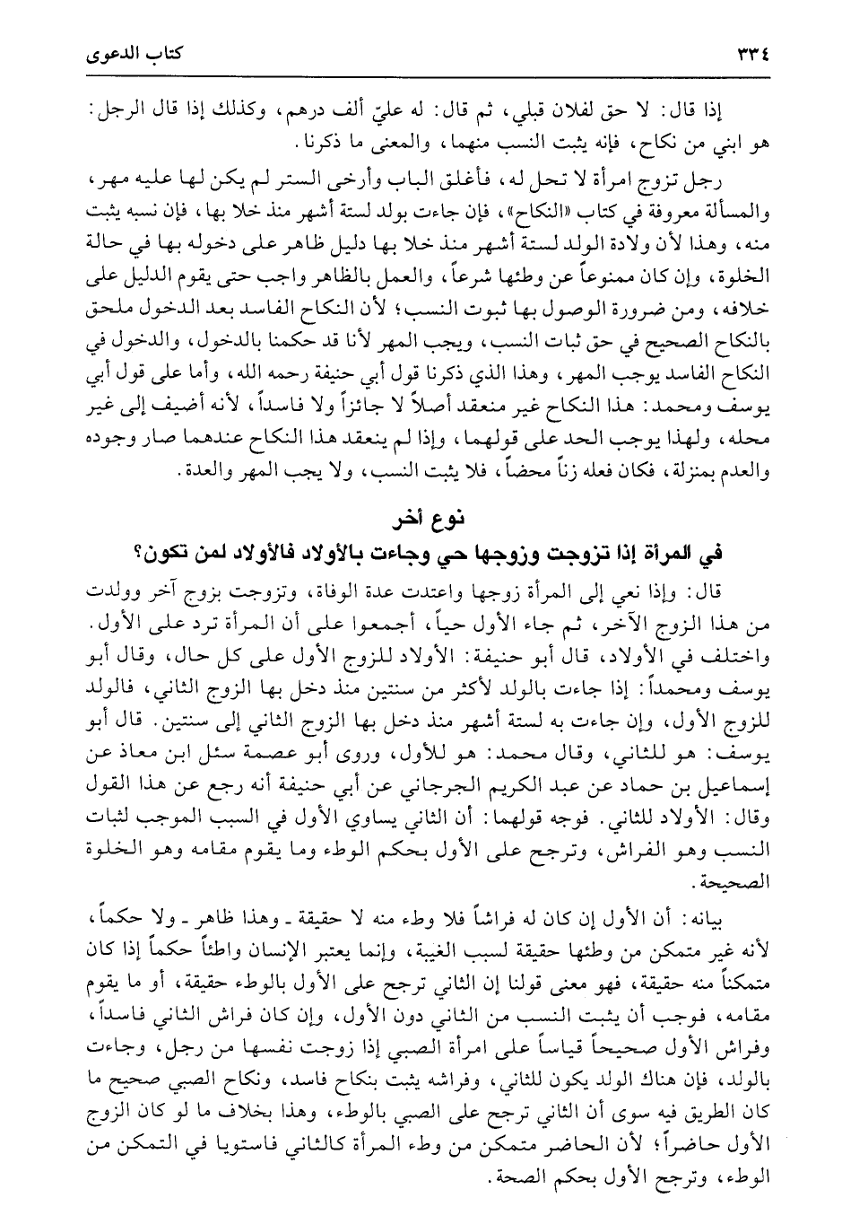 قال: وإذا نعي إلى المرأة زوجها واعتدت عدة الوفاة، وتزوجت بزوج آخر وولدت من هذا الزوج الآخر، ثم جاء الأول حياً، أجمعوا على أن المرأة ترد على الأول. واختلف في الأول، قال أبو حنيفة: الأولاد للزوج الأول على كل حال، وقال أبو يوسف ومحمداً: إذا جاءت بالولد لأكثر من سنتين منذ دخل بها الزوج الثاني، فالولد للزوج الأول، وإن جاءت به لستة أشهر منذ دخل بها الزوج الثاني إلى سنتين. قال أبو يوسف: هو للثاني، وقال محمد: هو للأول، وروى أبو عصمة سئل ابن معاذ عن إسماعيل بن حماد عن عبد الكريم الجرجاني عن أبي حنيفة أنه رجع عن هذا القول وقال: الأولاد للثاني. فوجه قولهما: أن الثاني يساوي الأول في السبب الموجب لثبات النسب وهو الفراش، وترجح على الأول بحكم الوطء وما يقوم مقامه وهو الخلوة الصحيحة.