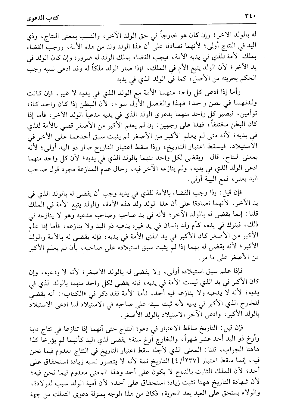 فإن قيل: التاريخ ساقط الاعتبار في دعوة النتاج حتى أنهما إذا تنازعا في نتاج دابة وأرخ ذو اليد أحد عشر شهراً، والخارج أرخ سنة؛ يقضى لذي اليد كأنهما لم يؤرخا كذا هاهنا الجواب، قلنا: المعنى الذي لأجله سقط اعتبار التاريخ في النتاج معدوم فيما نحن فيه، إنما سقط اعتبار (237أ4) التاريخ ثمة لأنه لا يتصور نسبه زيادة استحقاق على أحد؛ لأن الملك الثابت بالنتاج لا يكون على أحد (و) هذا المعنى معدوم فيما نحن فيه؛ لأن شهادة التاريخ ههنا تثبت زيادة استحقاق على أحد؛ لأن أمية الولد سبب للولادة، والولاء يستحق على العبد بعد الحرية، فكان من هذا الوجه بمنزلة دعوى التملك من جهة