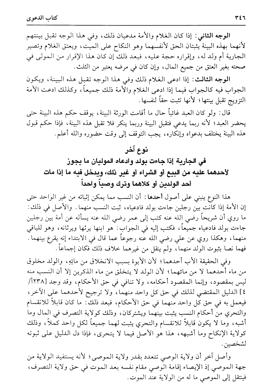 نوع آخر في الجارية إذا جاءت بولد وادعاه الموليان ما يجوز لأحدهما عليه من البيع أو الشراء أو غير ذلك، ويدخل فيه ما إذا مات أحد الولدين أو كلاهما وترك وصياً واحداً هذا النوع ينبني على أصول