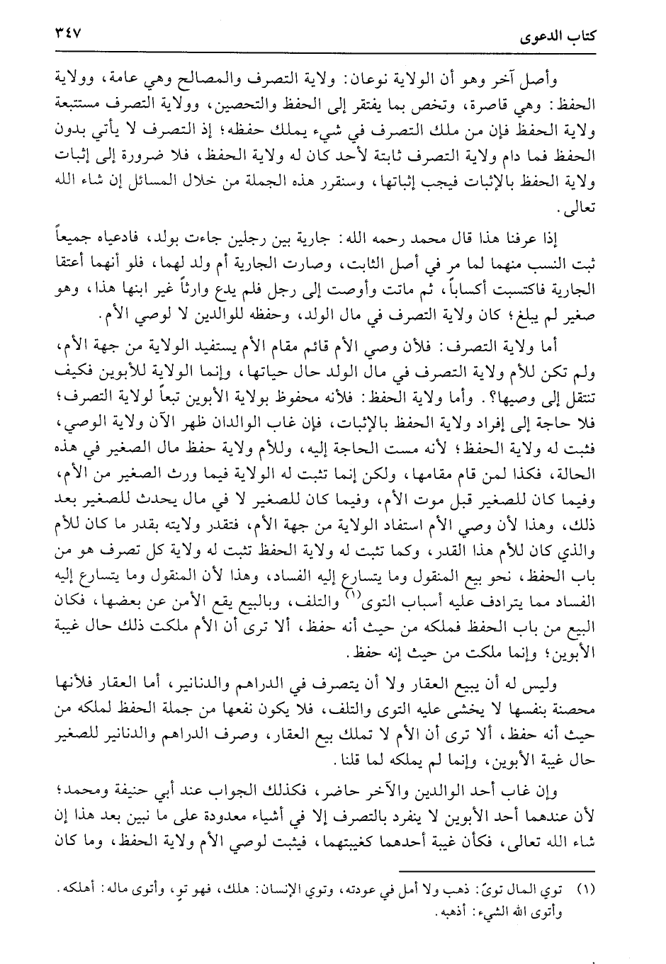 وأصل آخر وهو أن الولاية نوعان: ولاية التصرف والمصالح وهي عامة، وولاية الحفظ: وهي قاصرة، وتخص بما يفتقر إلى الحفظ والتحصين، وولاية التصرف مستتبعة ولاية الحفظ فإن من ملك التصرف في شيء يملك حفظه؛ إذ التصرف لا يأتي بدون الحفظ فما دام ولاية التصرف ثابتة لأحد كان له ولاية الحفظ، فلا ضرورة إلى إثبات ولاية الحفظ بالإثبات فيجب إثباتها، وسنقرر هذه الجملة من خلال المسائل إن شاء الله تعالى.