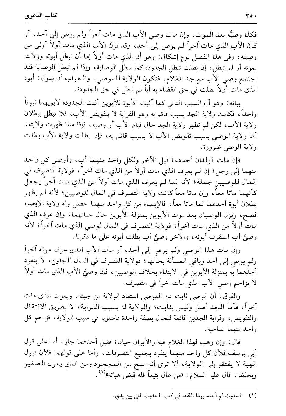 فكذا وصيُّه بعد الموت. وإن مات وصي الأب الذي مات آخراً ولم يوص إلى أحد، أو كان الأب الذي مات آخراً لم يوص إلى أحد، وقد ترك الأب الذي مات أولاً أولى من وصيته، وفي هذا الفصل نوع إشكال: وهو أن الذي مات أولاً إما أن تبطل أبوته وولايته بموته أو لم تبطل، إن بطلت تبطل الجدودة كما تبطل الوصاية، وإذا لم تبطل الوصاية فقد اجتمع وصي الأب مع جد الغلام، فتكون الولاية للموصي. والجواب أن يقول: أبوة الذي مات أولاً بطلت في حق القضاء به أباً لم تبطل في حق الجدودة.
